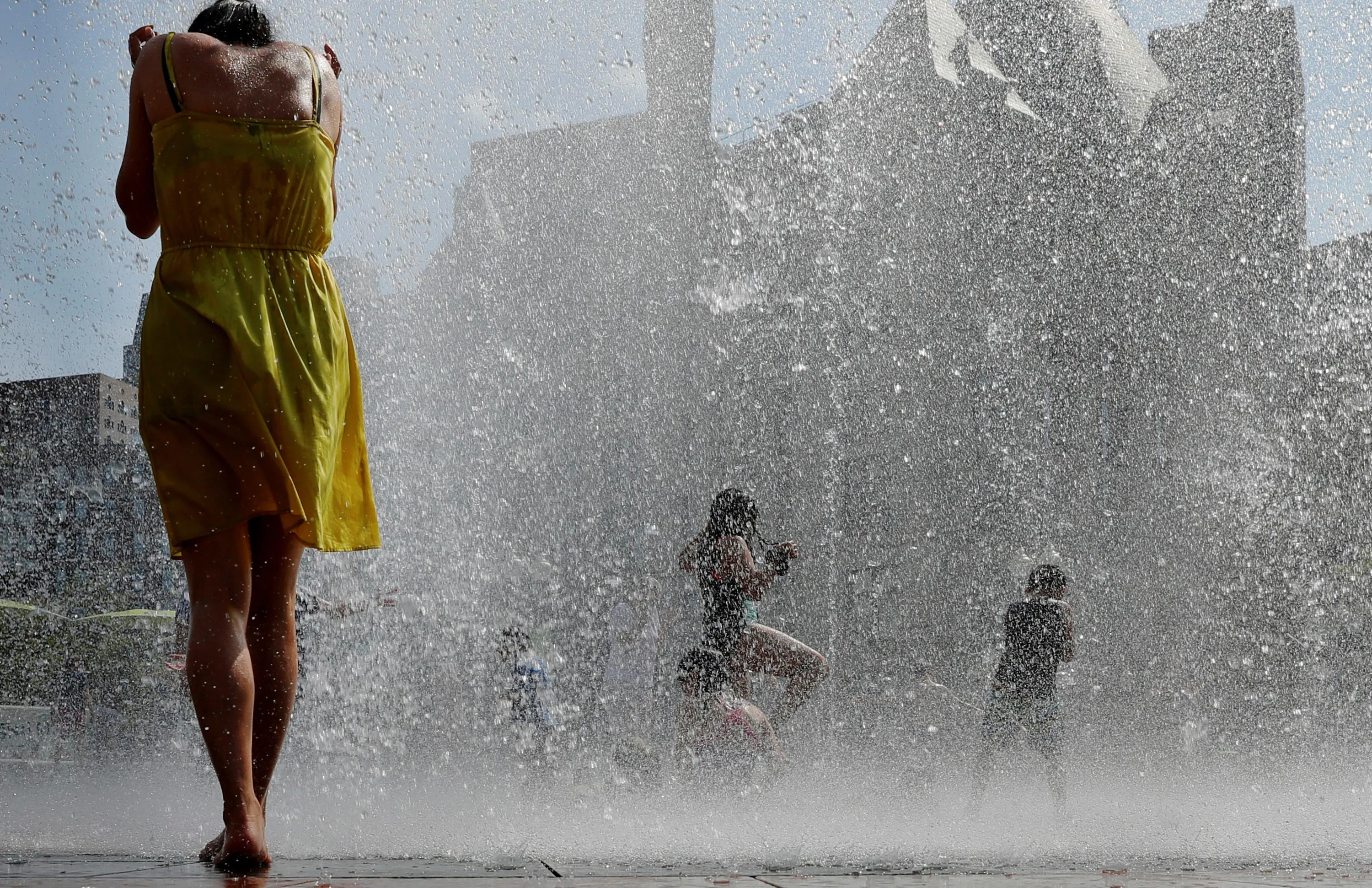 Kids and adults cool off in a fountain on the Rose Kennedy Greenway on the first day of a forecasted summer heatwave in Boston, Massachusetts, U.S., July 19, 2019. (Photo by Brian Snyder/Reuters)