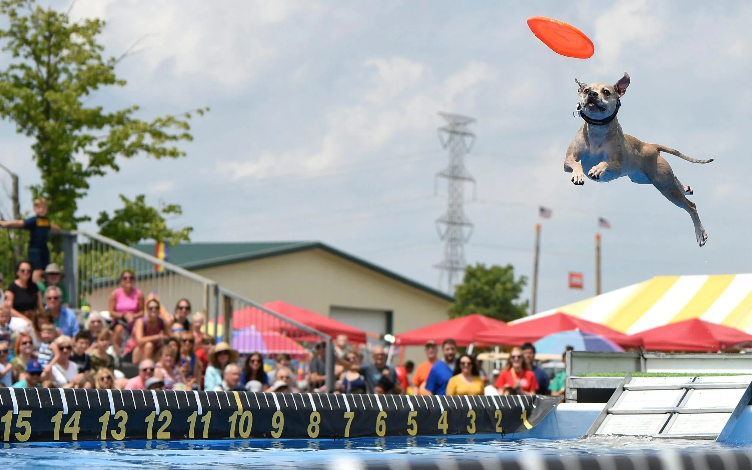 Coconut makes an attempt at catching a Frisbee while jumping for distance over a pool during the Canine Stars show during the Lake County Fair, Friday, July 26, 2019, in Grayslake, Ill. All dogs in the show are rescues. (Photo by Rick West/Daily Herald via AP Photo)