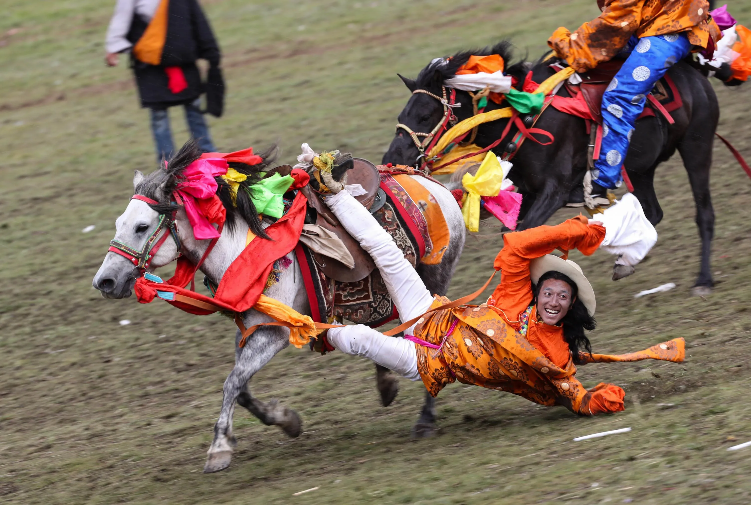 A rider performs horsemanship during a horse racing festival in Litang County, southwest China's Sichuan Province, July 30, 2019. (Photo by Jiang Hongjing/Xinhua News Agency/Alamy Live News)