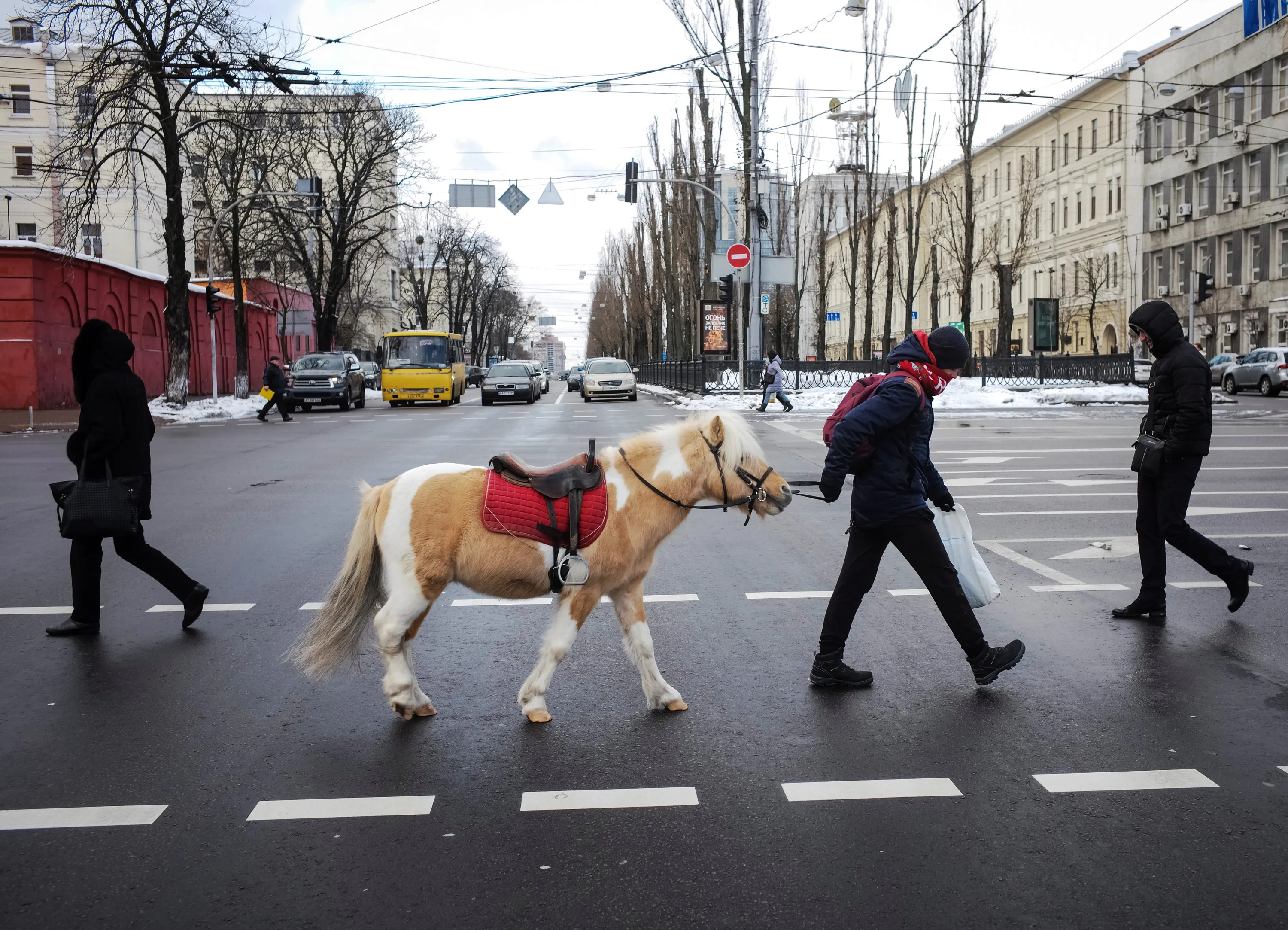 A man with a pony walks on a pedestrian crossing in central Kiev, Ukraine January 3, 2019. (Photo by Gleb Garanich/Reuters)