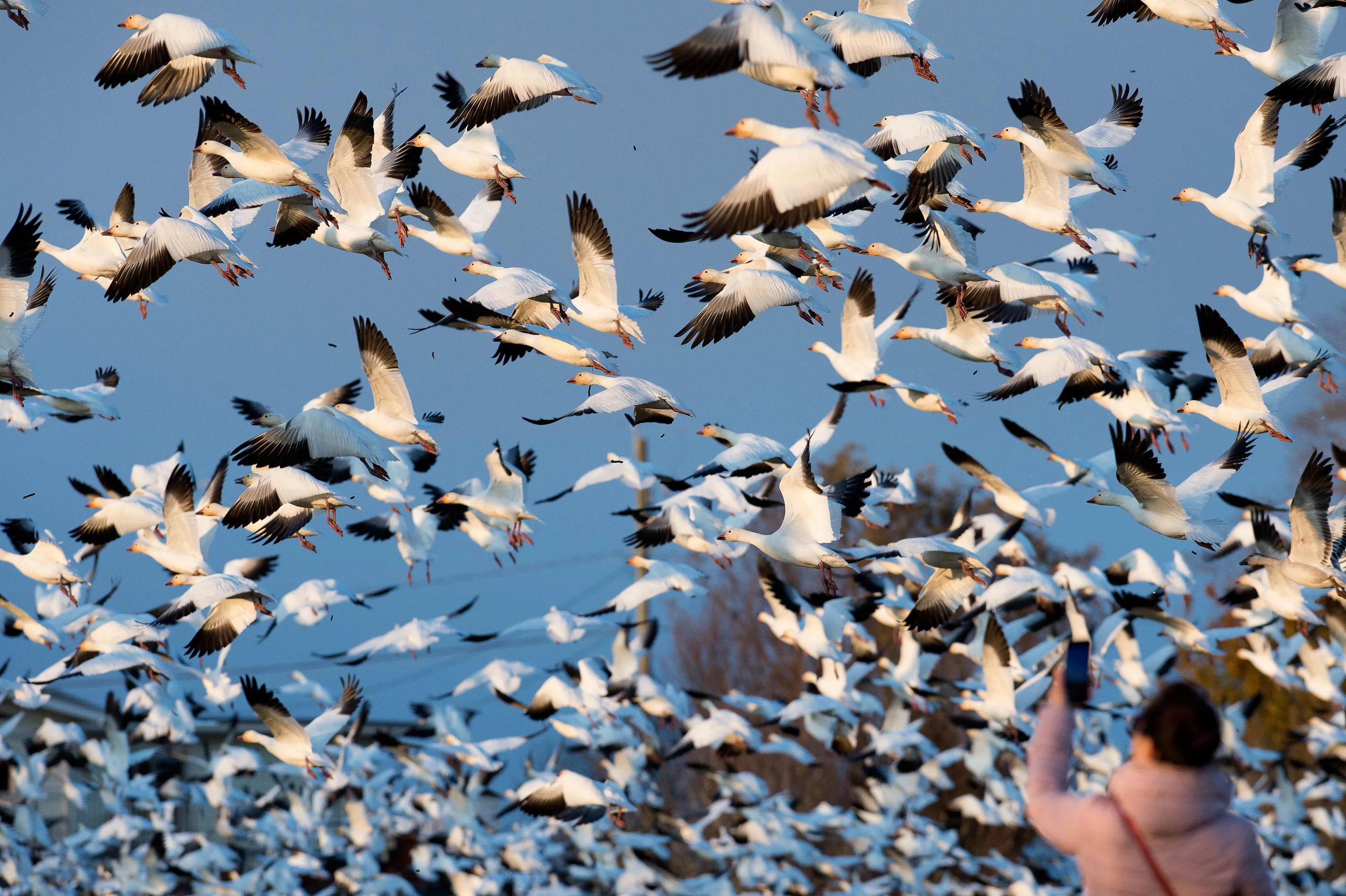 Snow geese at the Terra Nova bird sanctuary in Richmond, Canada. An estimated 100,000 snow geese have descended upon the Terra Nova bird sanctuary to feed before heading south to warmer destinations, including the US states of Washington and California. (Photo by Andrew Soong/Xinhua/Barcroft Images)
