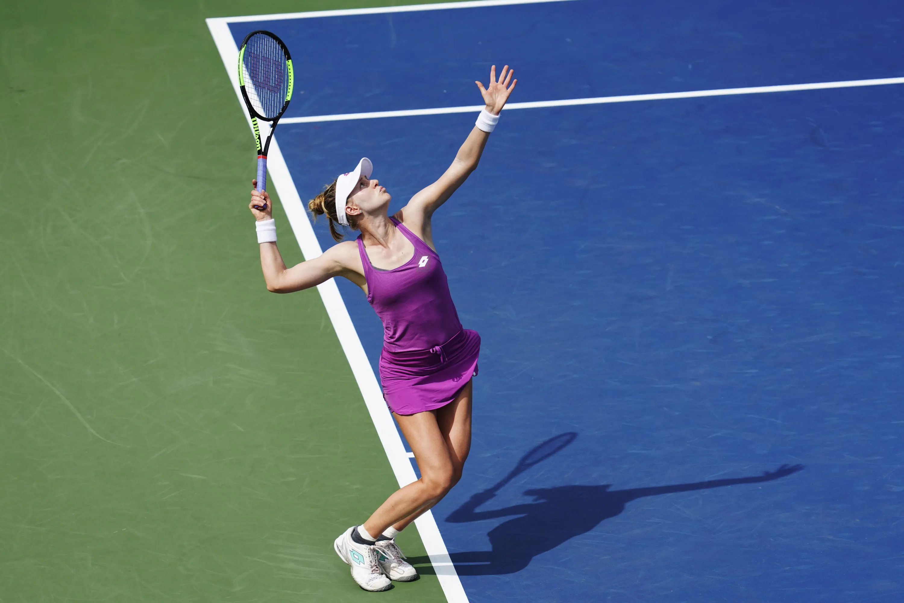 Alison Riske serves to Karolina Pliskova, of the Czech Republic, during a second round match at the Rogers Cup tennis tournament in Toronto, Wednesday, August 7, 2019. (Photo by Mark Blinch/The Canadian Press via AP Photo)