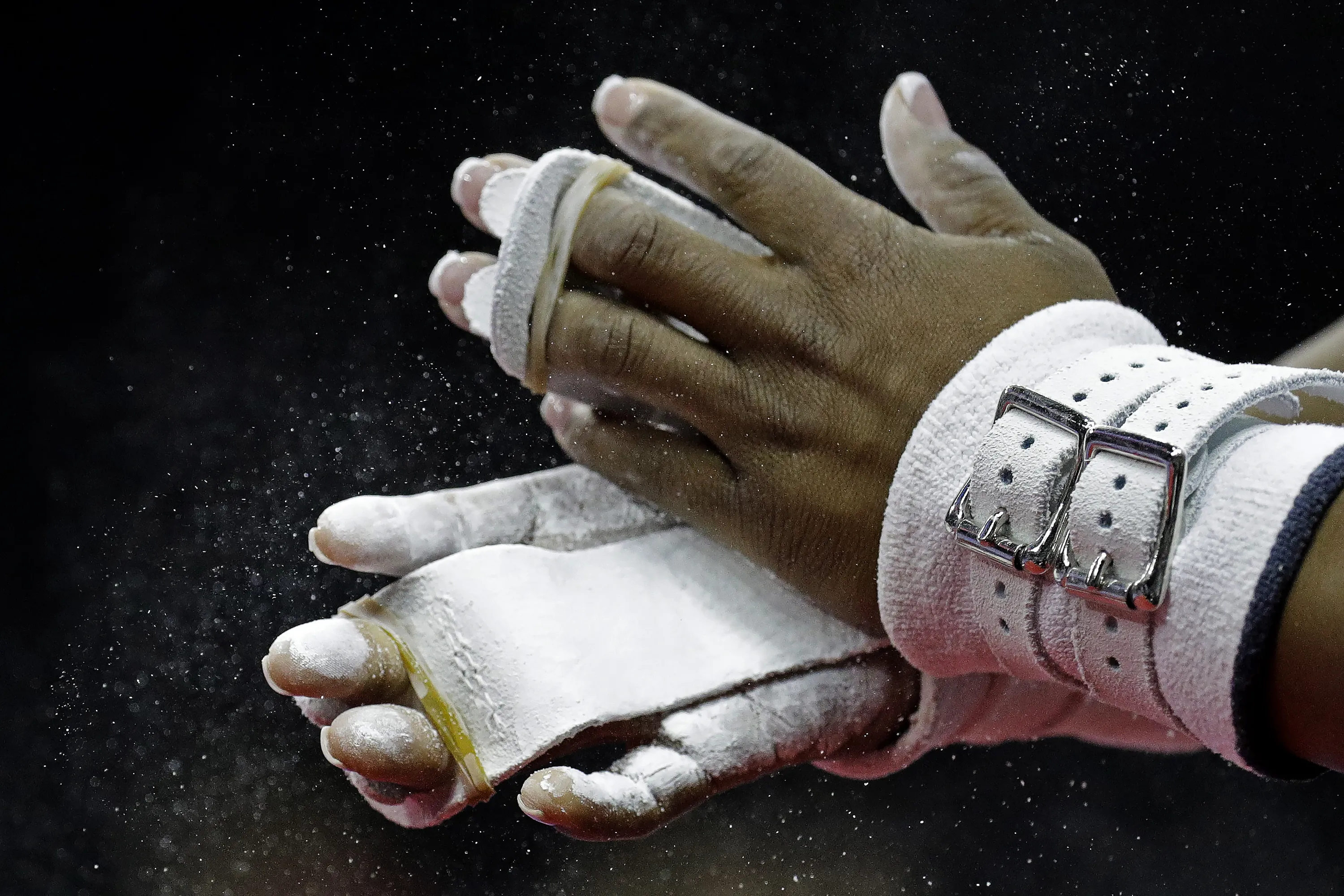 Simone Biles chalks her hands before working on the uneven bars during practice for the U.S. Gymnastics Championships Wednesday, August 7, 2019, in Kansas City, Mo. (Photo by Charlie Riedel/AP Photo)