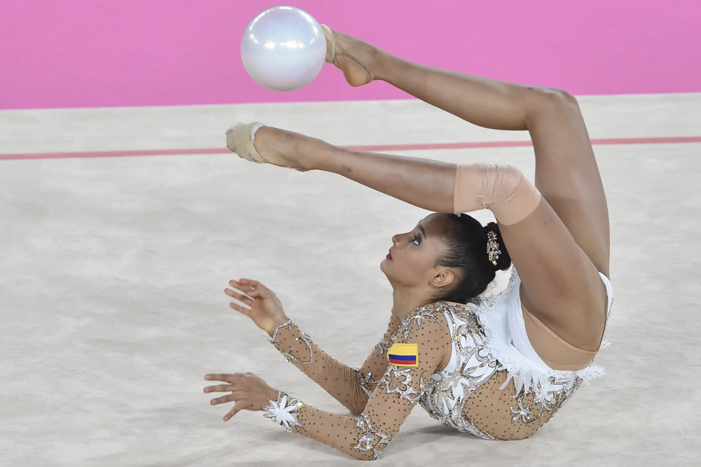 Colombian Oriana Vinas performs her routine in the Individual Rhythmic Gymnastics Ball Finals competition during the Lima 2019 Pan-American Games at the Villa El Salvador Sport Center in Lima on August 4, 2019. (Photo by Cris Bouroncle/AFP Photo)
