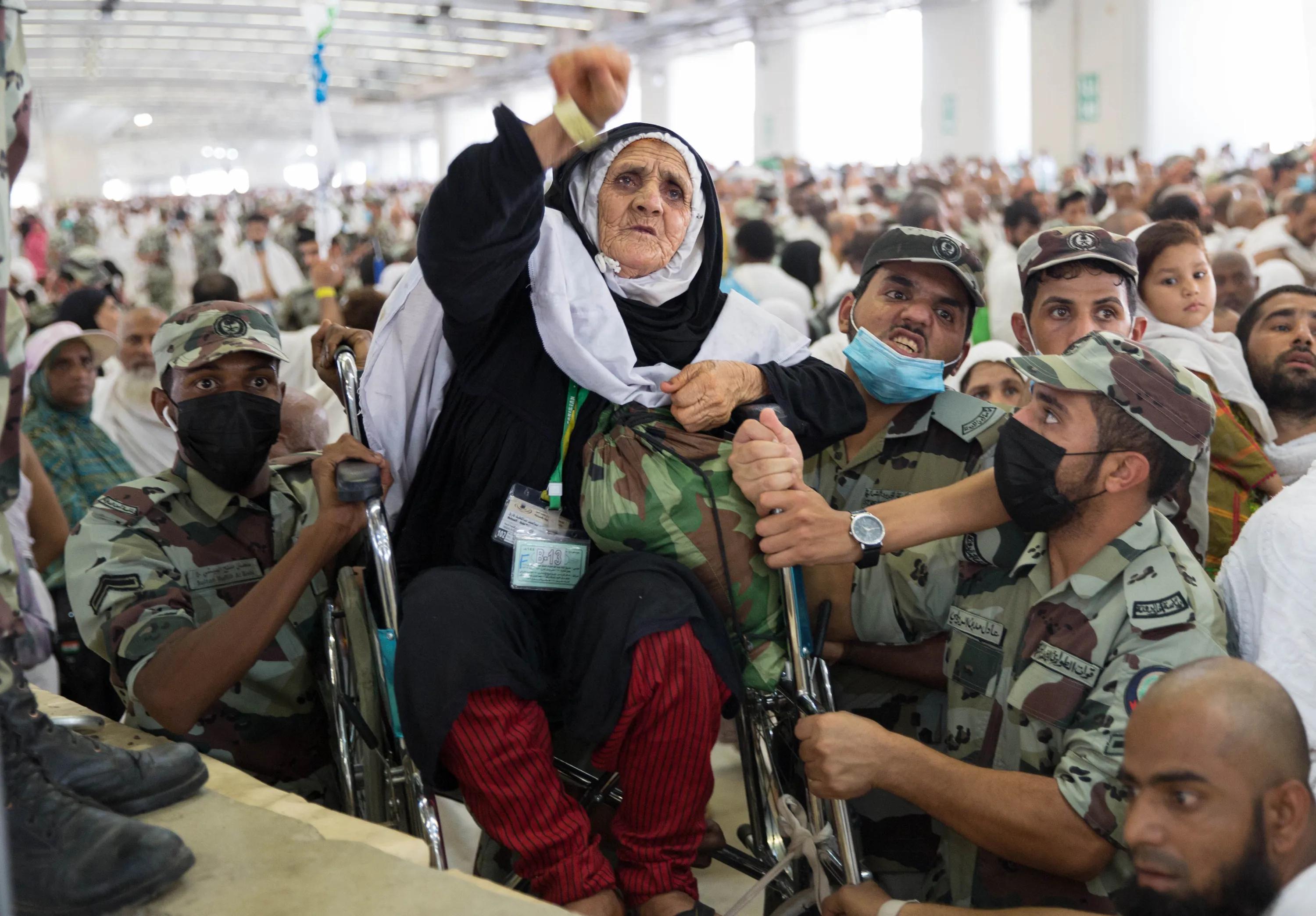 Saudi soldiers carry a woman on wheelchair as she throws pebbles as part on the symbolic al-A'qabah (stoning of the devil ritual) at the Jamarat Bridge during the Hajj pilgrimage near Mecca, Saudi Arabia, 11 August 2019. According to Saudi authorities, around 2.5 million Muslims are expected to attend this year's Hajj pilgrimage, which is highlighted by the Day of Arafah, one day prior to Eid al-Adha. Eid al-Adha is the holiest of the two Muslims holidays celebrated each year, it marks the yearly Muslim pilgrimage (Hajj) to visit Mecca, the holiest place in Islam. (Photo by EPA/EFE/Stringer)