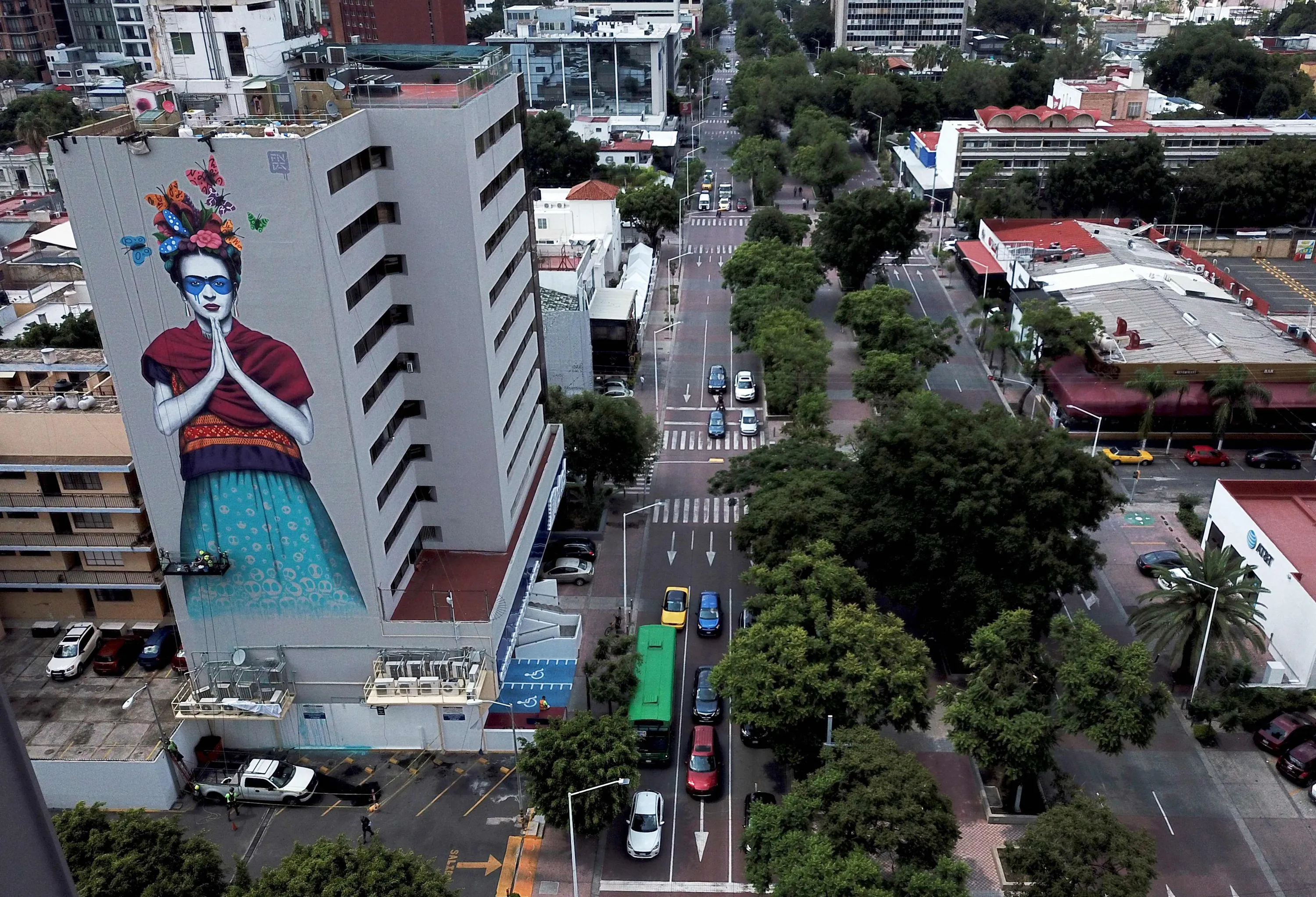 Aerial view of Irish urban artist Fin Dac's mural “Magdalena”, in honor of Mexican painter Magdalena Carmen Frida Kahlo, in the month of her birth, in Guadalajara, Jalisco state, Mexico, on July 14, 2019. (Photo by Ulises Ruiz/AFP Photo)