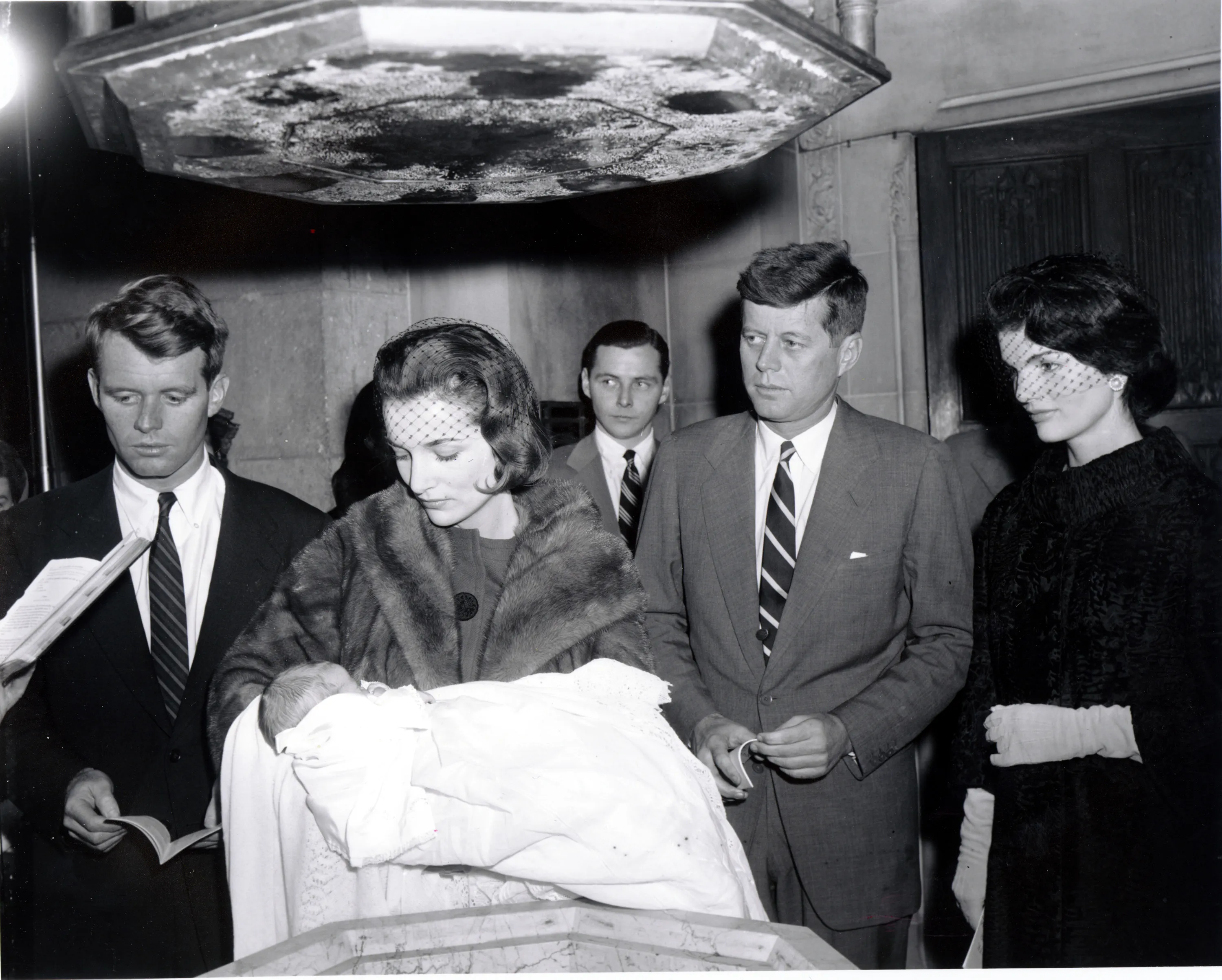 Sen. John Kennedy, D-Mass., and his wife, Jacqueline Kennedy, watch as her sister, Mrs. Lee Bouvier Canfield, holds their 15-day-old daughter during her christening in St. Patrick's Cathedral in New York City on December 13, 1957. At left is the senator's brother, Robert Kennedy, acting as godfather. Third from left is Stephen Smith, the senator's brother-in-law. Boston's archbishop Richard Cushing christened the baby, named Caroline. (Photo by AP Photo)