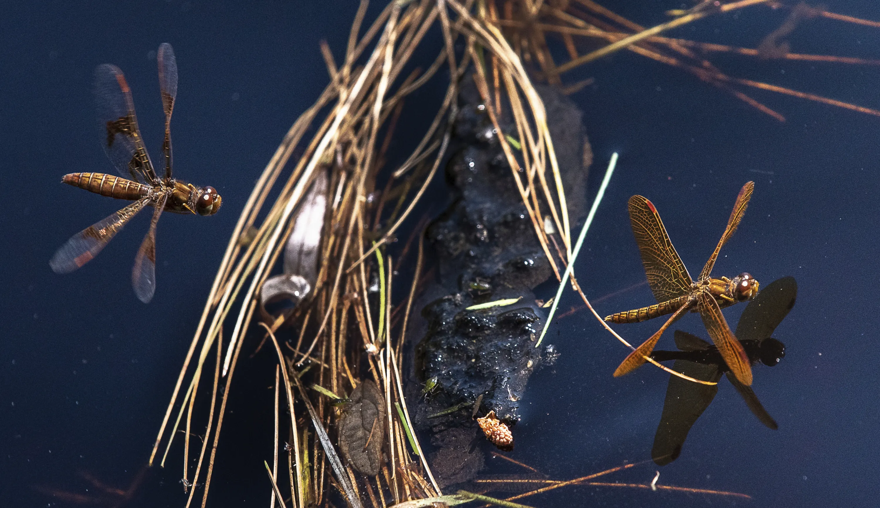 A pair of dragonflies dance around a pond at Pineland Farms in New Gloucester, Maine, Monday, July 15, 2019. (Photo by Russ Dillingham/Sun Journal via AP Photo)