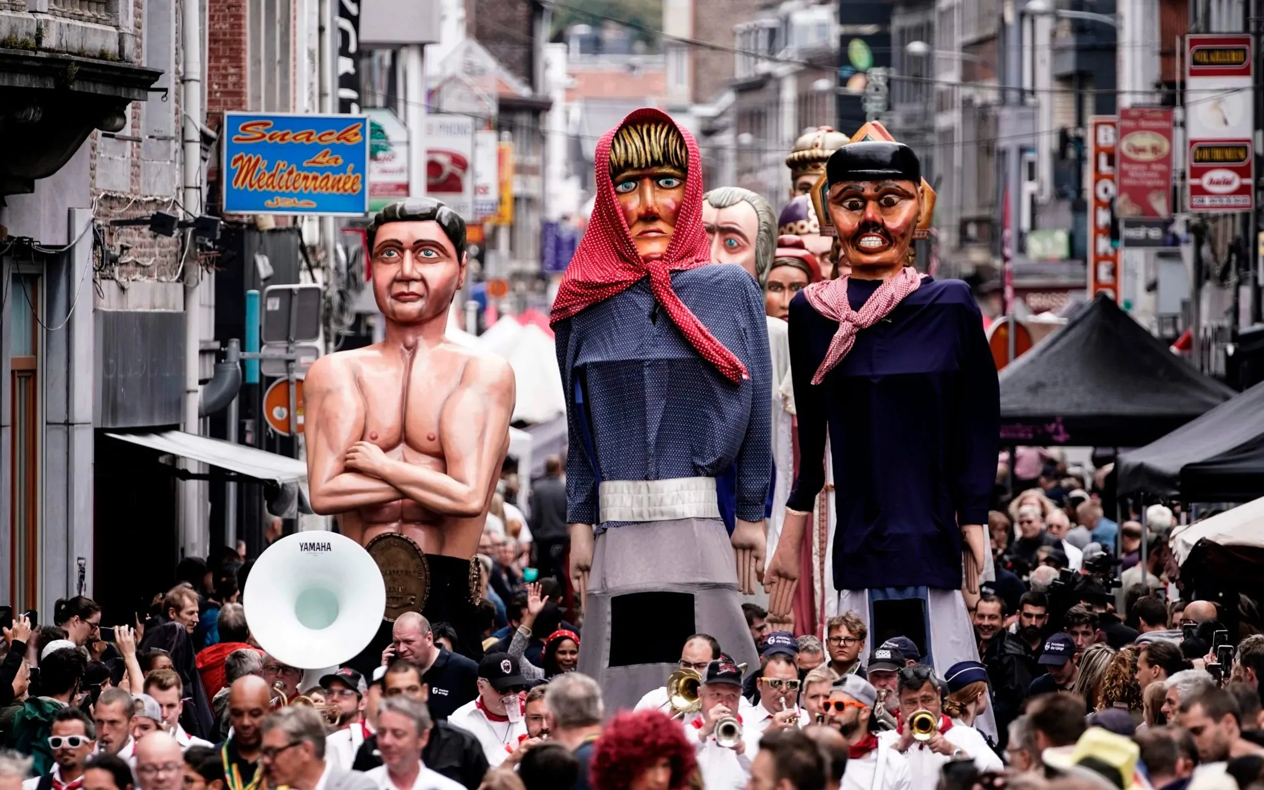 Giant puppets are carried through the streets during a folk parade on August 15, 2019 in Outremeuse, Liege, Belgium, on August 15, 2019 during Assumption Day celebrations. (Photo by Kenzo Tribouillard/AFP Photo)