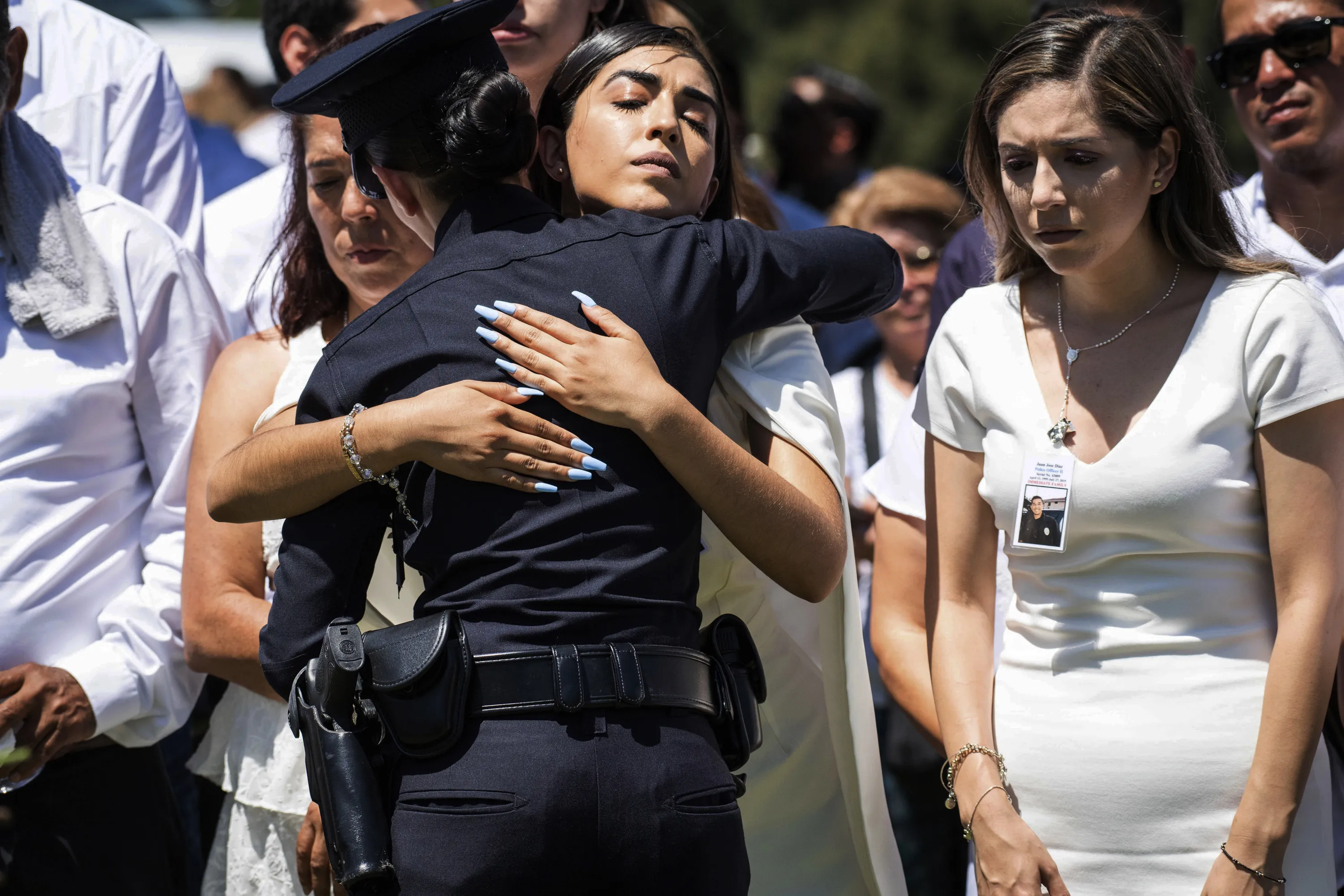 A Los Angeles Police Department officer hugs Anahi Diaz, center, after placing a flower on her brother Officer Juan Jose Diaz's coffin during the funeral at Forest Lawn Hollywood Hills cemetery, Monday, August 12, 2019, in Los Angeles. Diaz was killed while off duty in Lincoln Heights after visiting a taco stand. (Photo by Sarah Reingewirtz/The Orange County Register via AP Photo)