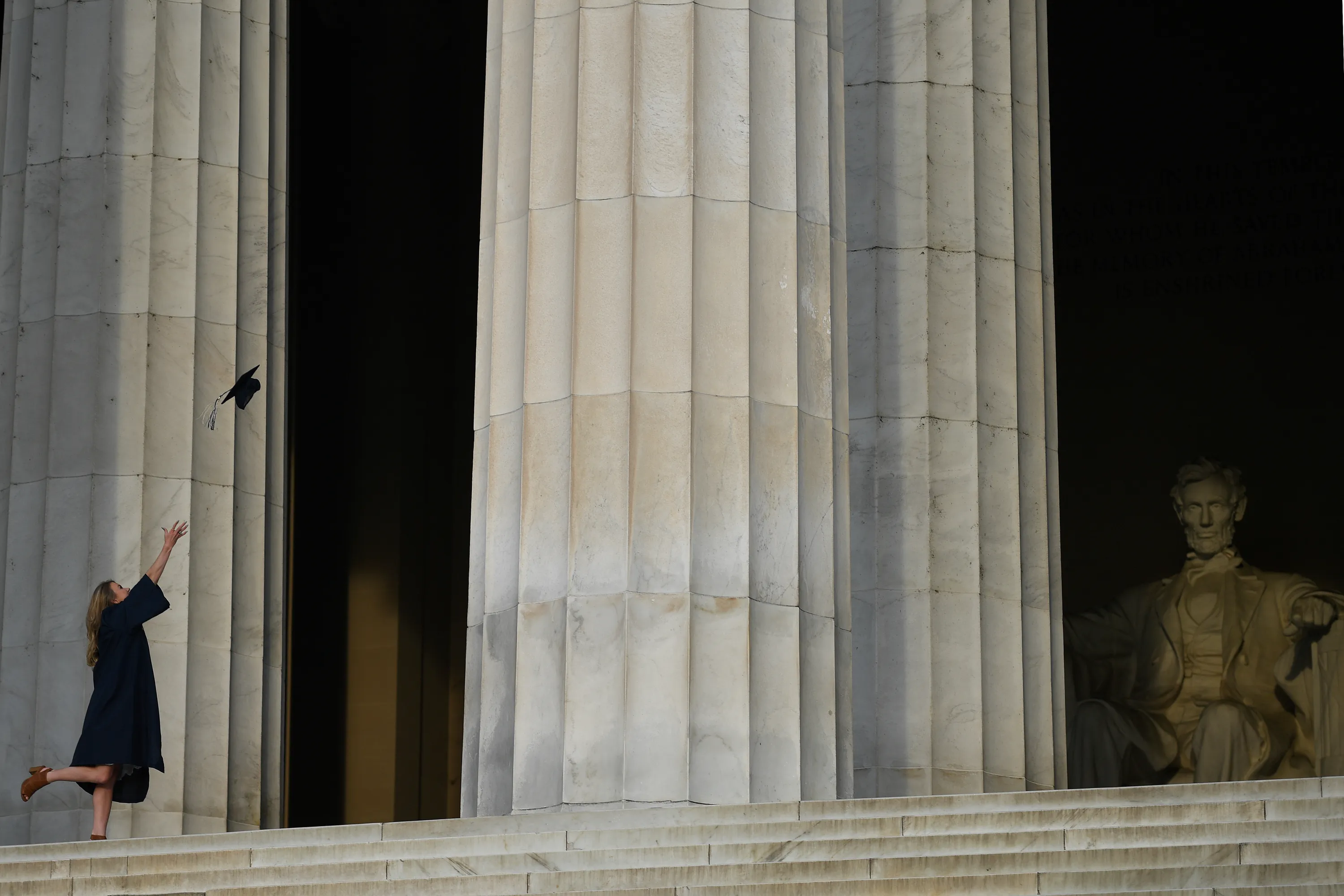 A woman throws her graduation mortar board cap in the air as she poses for her photographer in front of the Lincoln Memorial in Washington, D.C., U.S. April 30, 2019. (Photo by Clodagh Kilcoyne/Reuters)