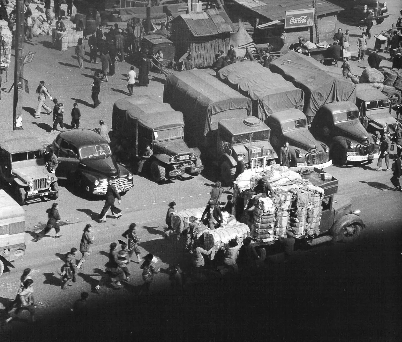 1948年3月,外滩,一群妇女儿童追赶一辆满载棉花的卡车。 (In March 1948, the Bund, a group of women and children to catch up with a truck loaded with cotton)