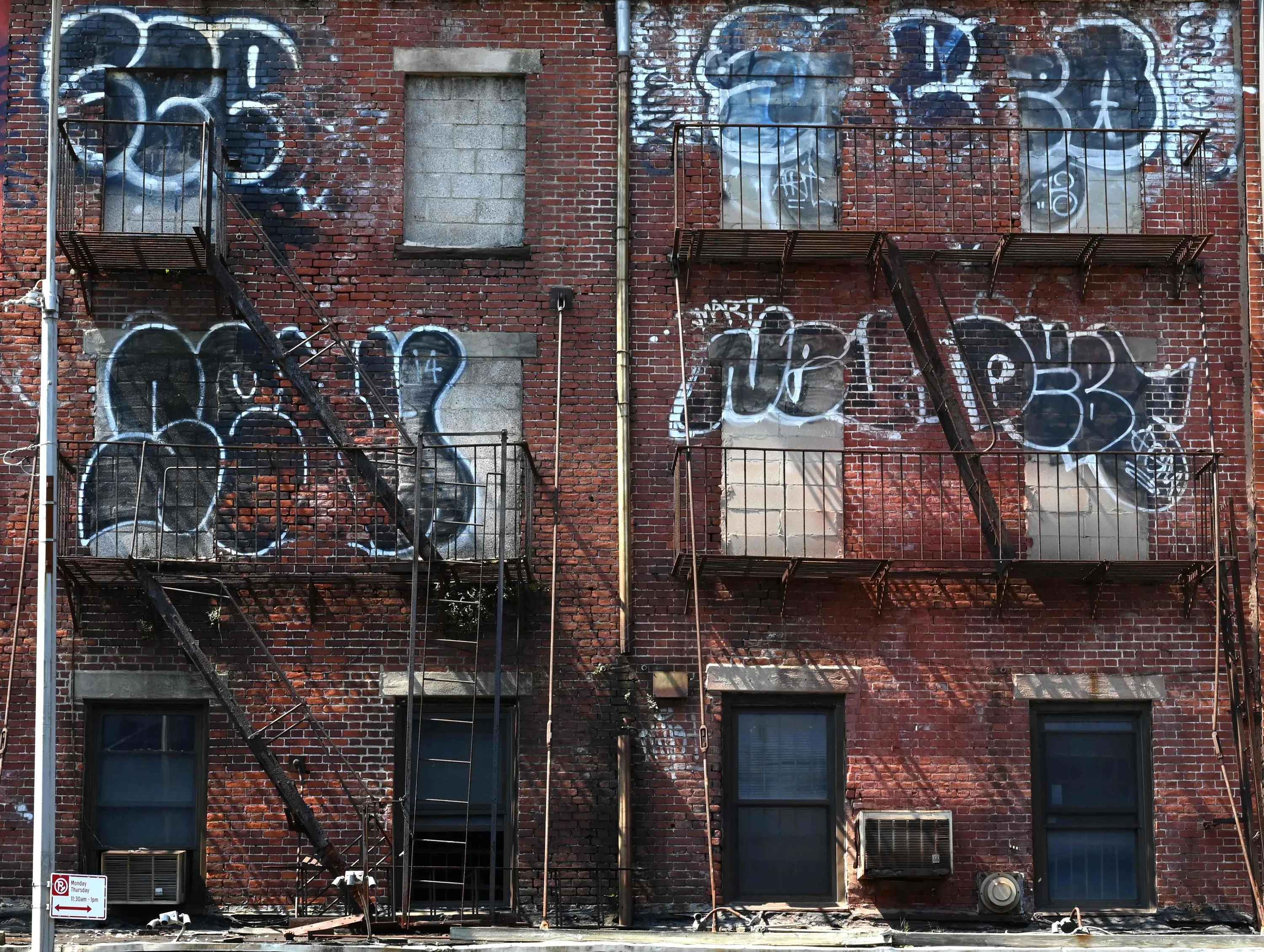 A grafitti covered building is seen in the South Street Seaport in Lower Manhattan in New York on August 15, 2019. (Photo by Timothy A Clary/AFP Photo)