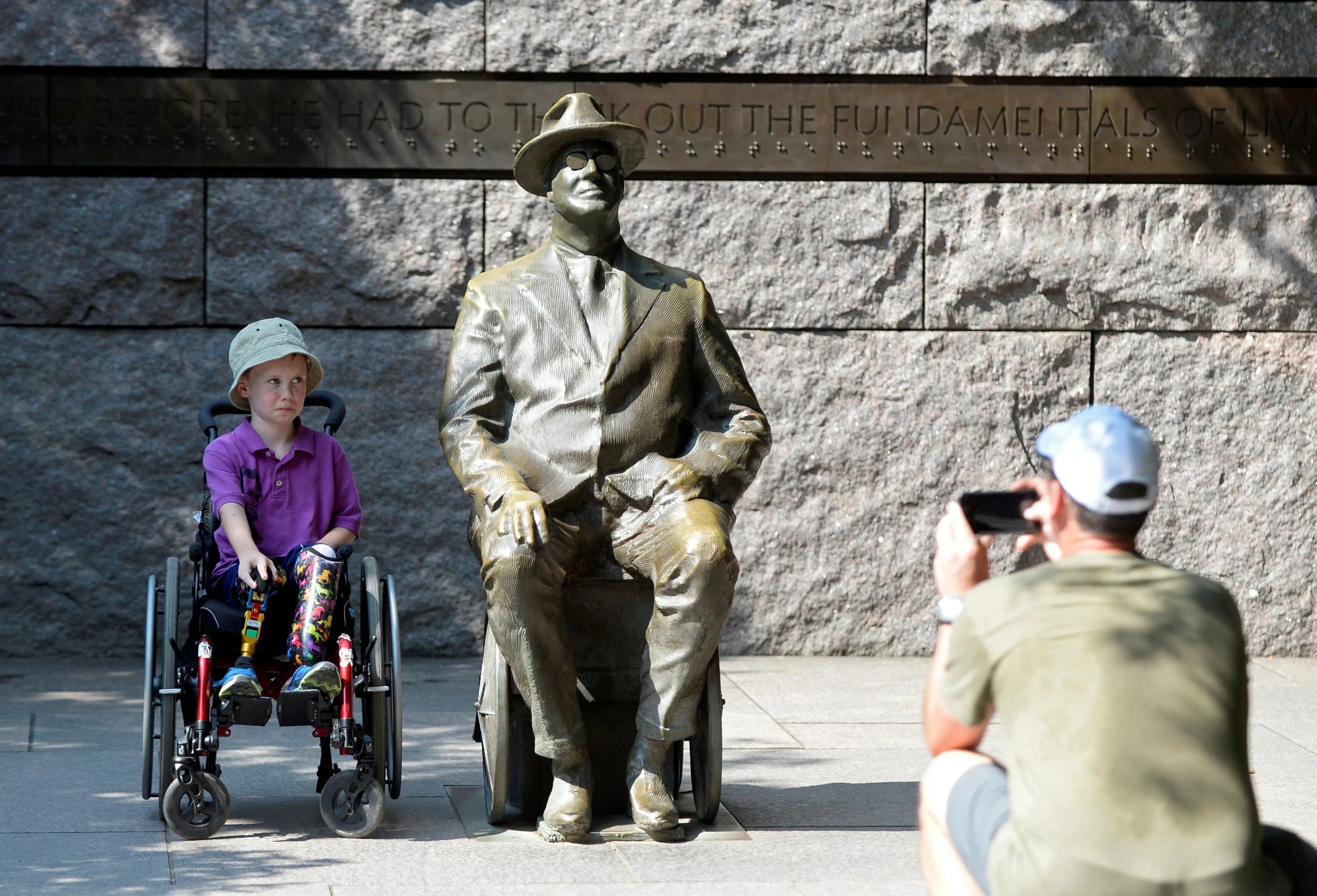 Ulysses Watko, 7, visiting from Portland, OR, sits next to a sculpture of Franklin Delano Roosevelt in his wheelchair while his dad Brian Watko takes a picture at the Franklin Delano Roosevelt Memorial in Washington, U.S., August 7, 2019. (Photo by Mary F. Calvert/Reuters)