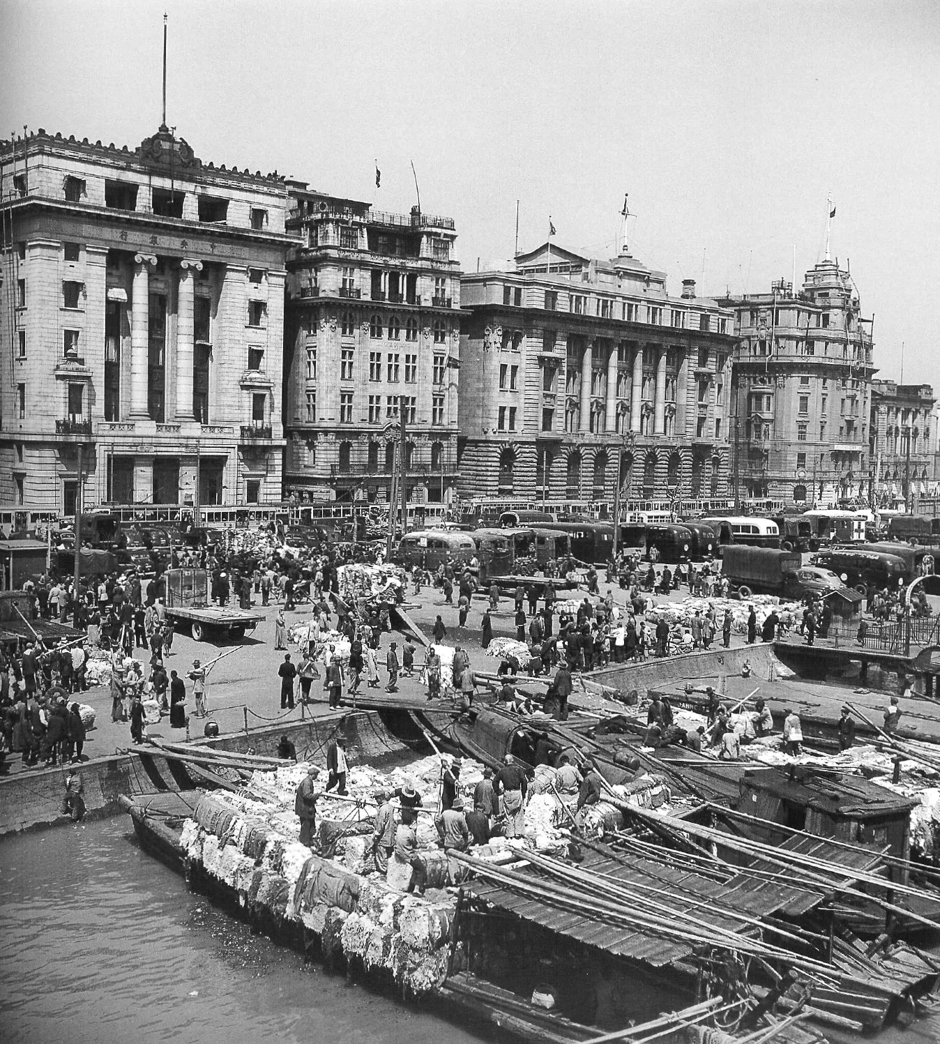 1948年3月,外滩,满载美国棉花的驳船。 (March 1948, the Bund, fully loaded barges of U.S. cotton)