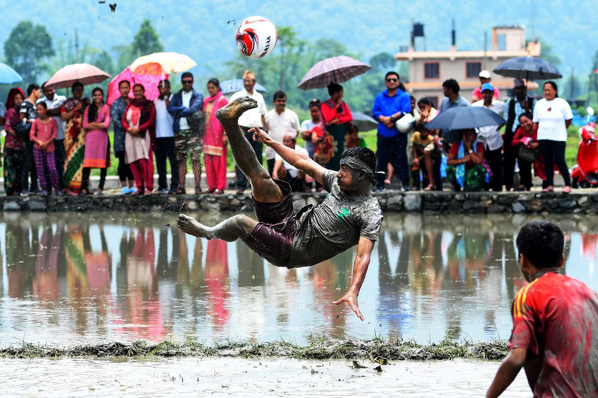 A Nepali youth plays in a rice paddy field during National Paddy Day at Pokhara, some 200 kms west of Kathmandu on June 30, 2019.The farmers are celebrating National Paddy Day on “Asar 15” of the Nepali calendar as the annual rice planting season begins. (Photo by Prakash Mathema/AFP Photo)