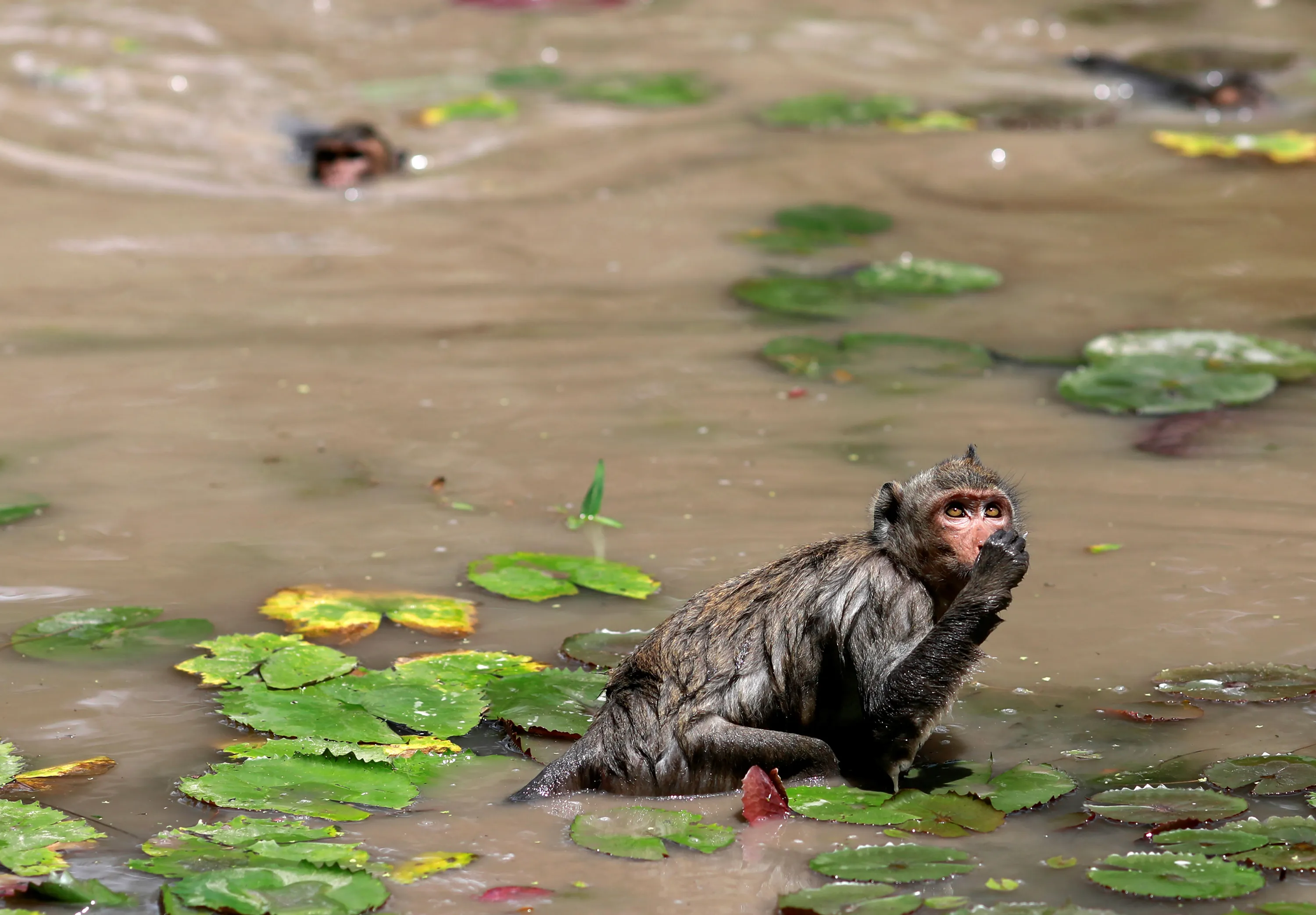 Monkeys collect lotus in a lake to eat as food, at a temple near Angkor Wat, in Siem Reap, Cambodia on August 19, 2019. (Photo by Soe Zeya Tun/Reuters)