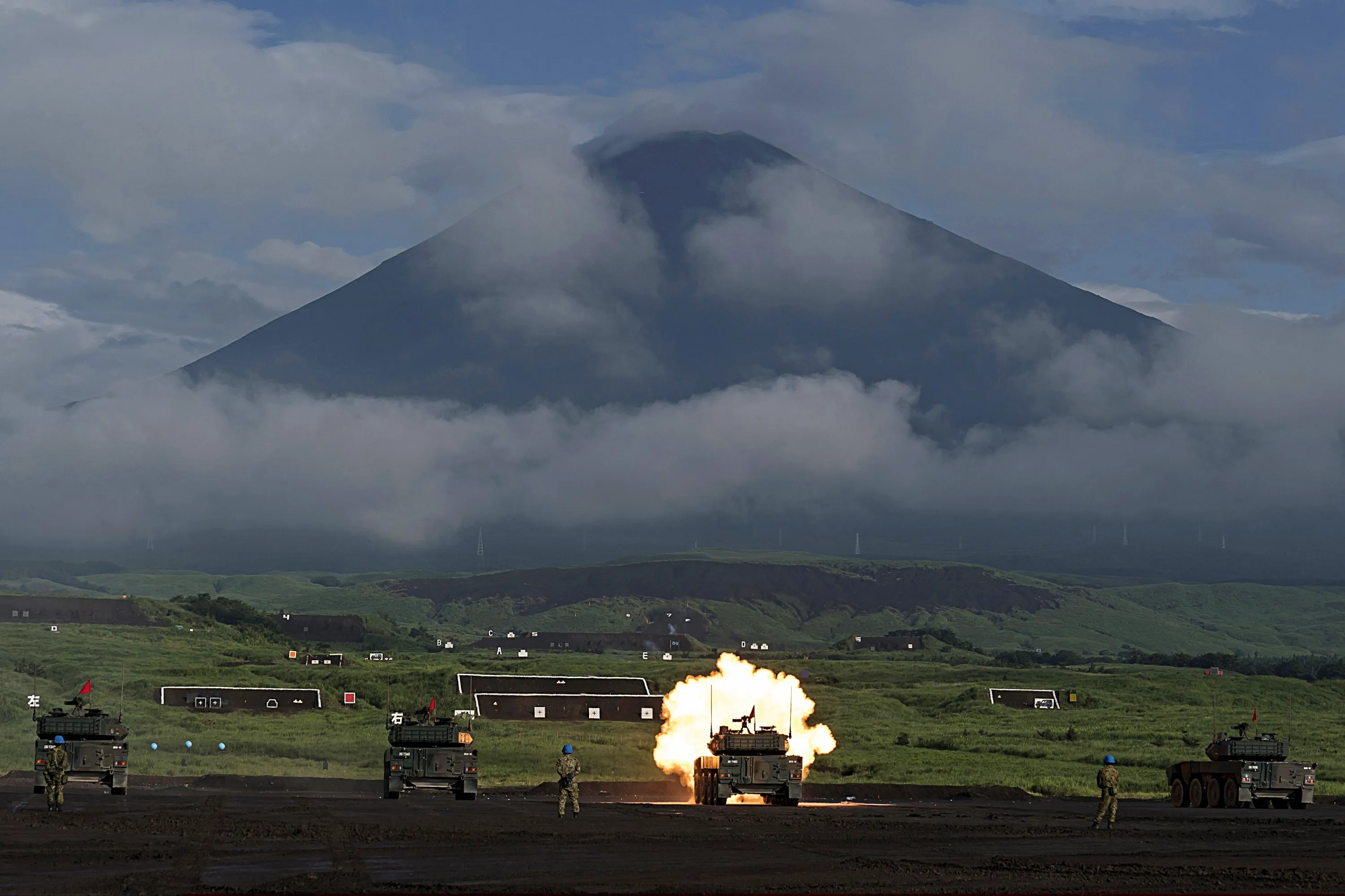 A Japan Ground Self-Defense Force battle tank fires ammunition during a live fire exercise at the foot of Mount Fuji in the Hataoka district of the East Fuji Maneuver Area on August 22, 2019 in Gotemba, Shizuoka, Japan. (Photo by Tomohiro Ohsumi/Getty Images)