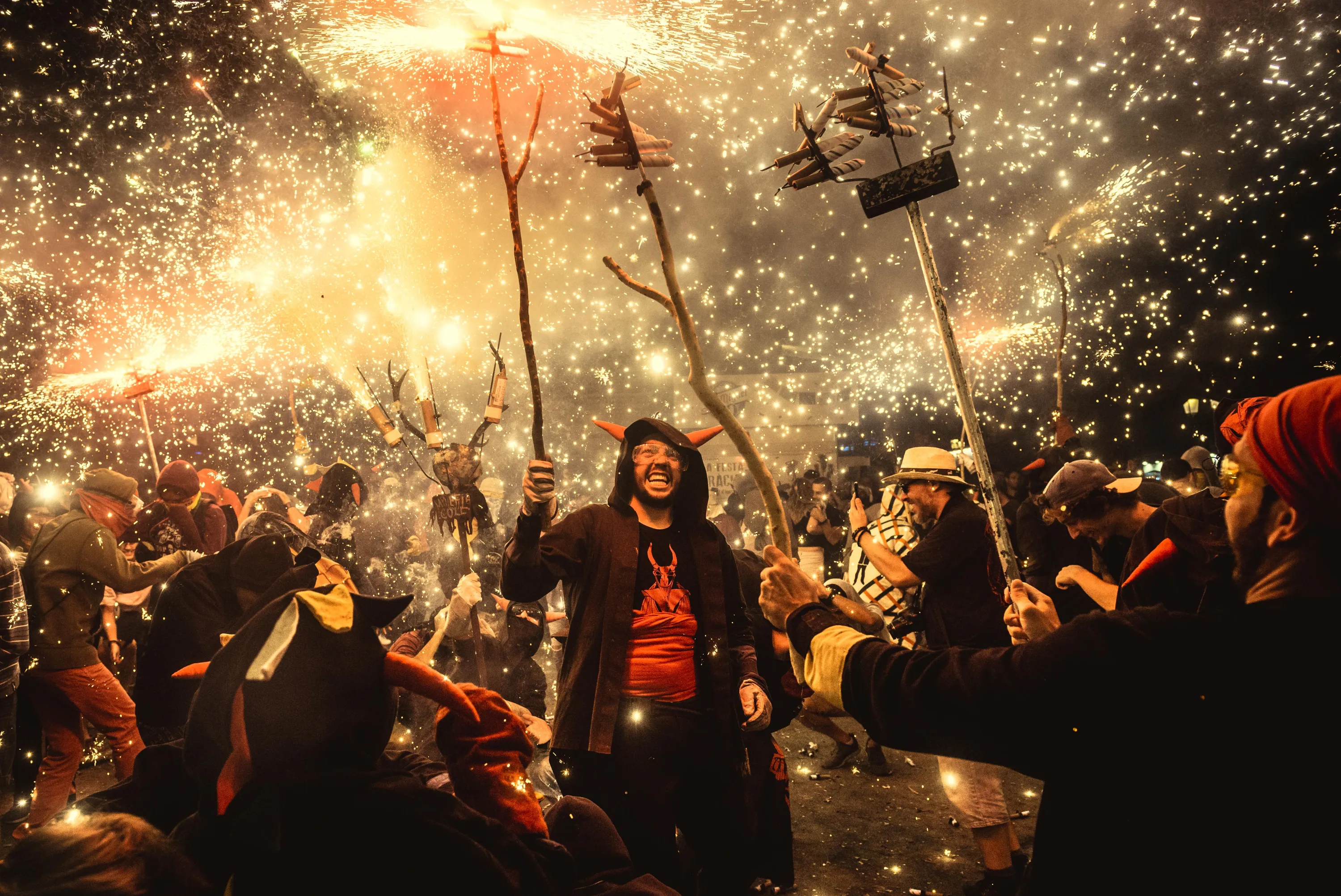 Fire runners in devil costumes dance to traditional drums under fireworks during the “Correfocs” at the “Festa Major de Gracia” in Barcelona, Spain on August 21, 2019. (Photo by Matthias Oesterle/ZUMA Wire/Rex Features/Shutterstock)