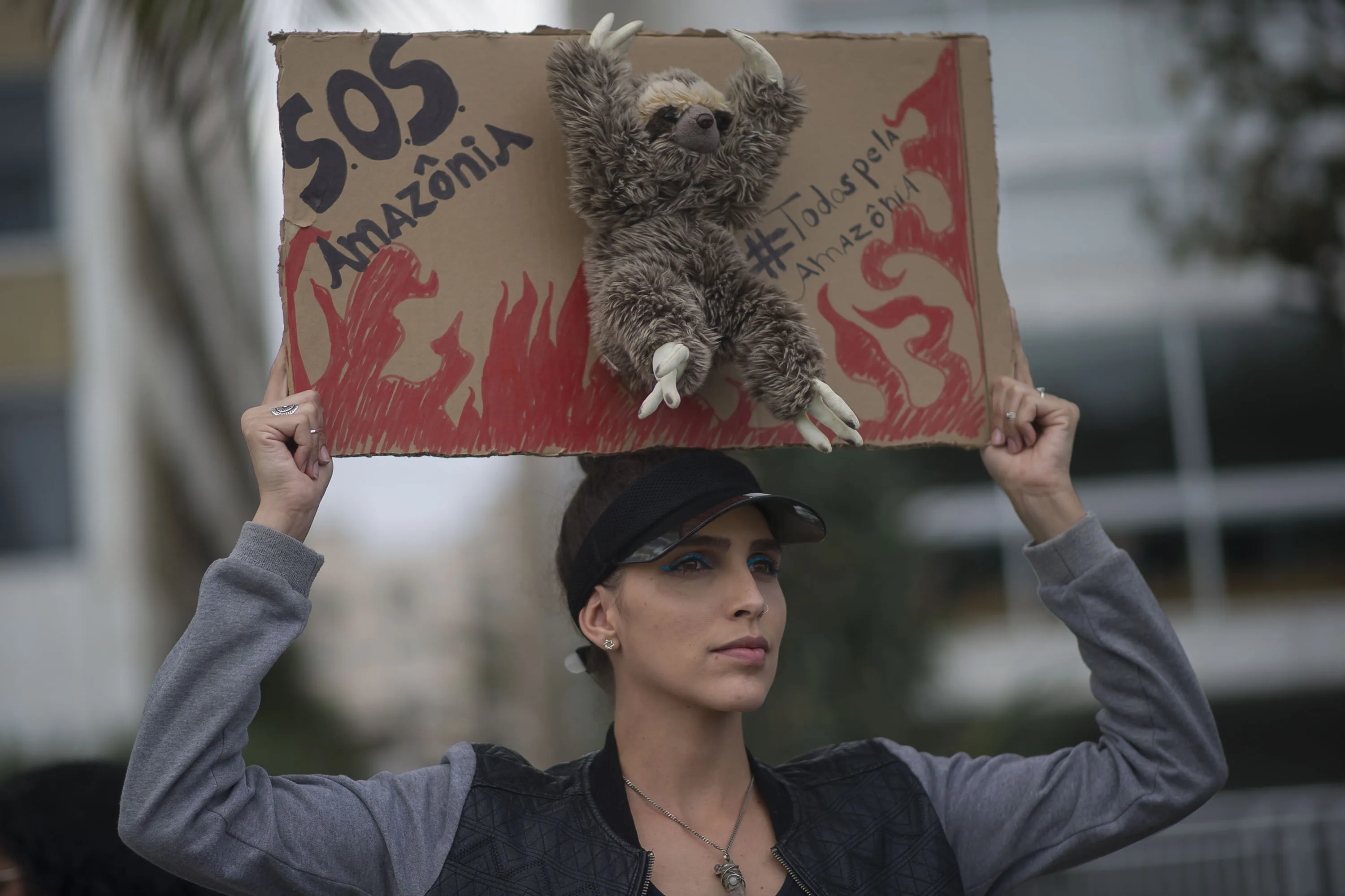 A woman holds up a sign that reads “SOS Amazons. Everybody for the Amazon” featuring a stuffed sloth animal during a protest in defense of the Amazon while wildfires burn in that region, in Rio de Janeiro, Brazil, Sunday, August 25, 2019. Experts from the country's satellite monitoring agency say most of the fires are set by farmers or ranchers clearing existing farmland, but the same monitoring agency has reported a sharp increase in deforestation this year as well. (Photo by Bruna Prado/AP Photo)