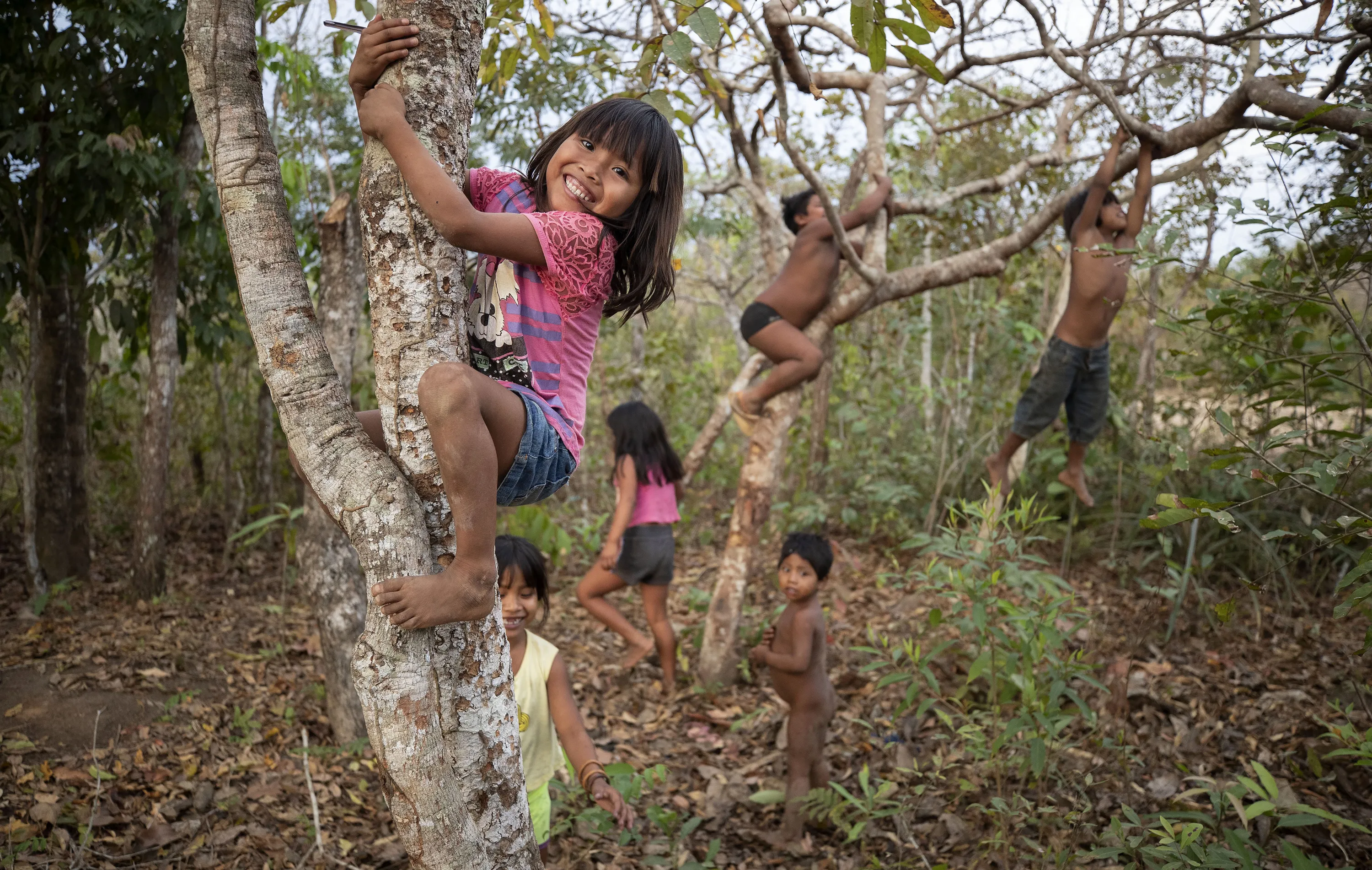 In this August 26, 2019 photo, children of the Nambikwara Sarare tribe climb trees as they play in their indigenous reserve in the southwestern Amazon, near Conquista D'Oeste, in the Brazilian state of Mato Grosso. About 98% of all Brazil’s indigenous lands lie within the Amazon. (Photo by Andre Penner/AP Photo)