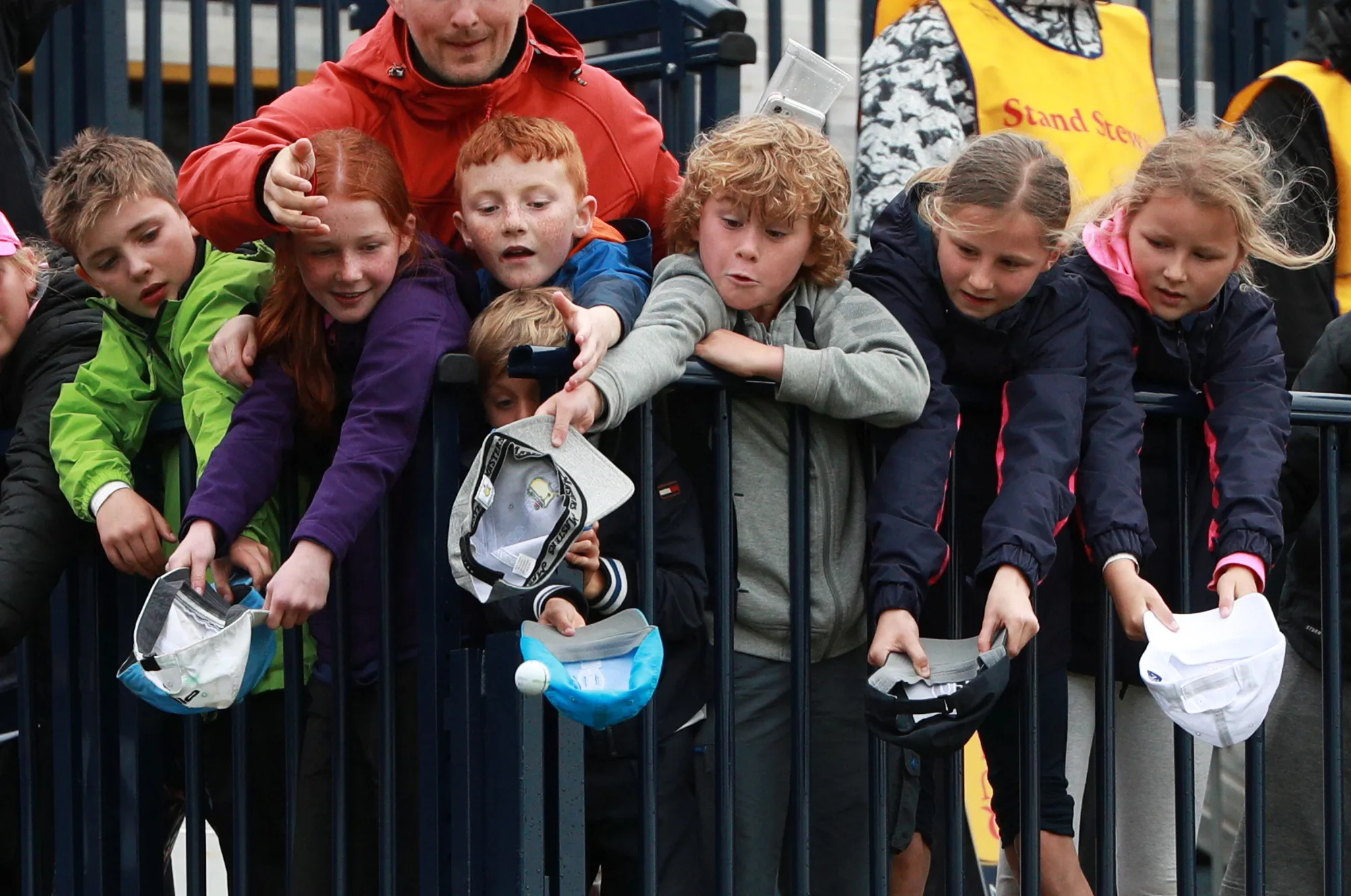 A young fan catches a ball thrown by Republic of Ireland's Padraig Harrington on the 18th during the second round of the British Open golf Championships at Royal Portrush golf club in Northern Ireland on July 19, 2019. (Photo by Ian Walton/Reuters)
