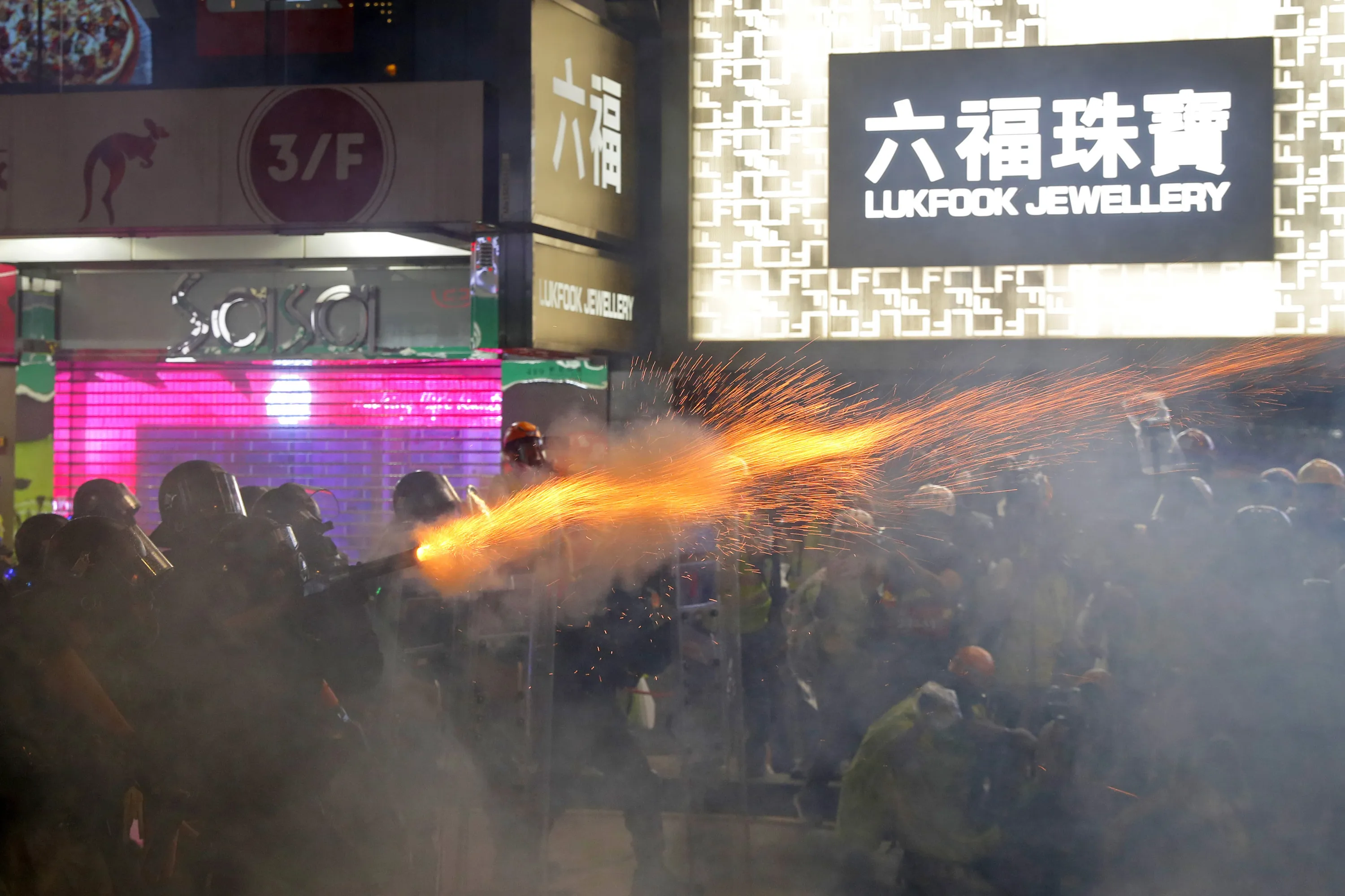 Policemen fire tear gas shells toward protestors at a shopping district of Hong Kong, Saturday, August 31, 2019. Many of the protesters outside Hong Kong government headquarters have retreated as large contingents of police arrive on the streets in what looks like preparation for a clearing operation. (Photo by Kin Cheung/AP Photo)