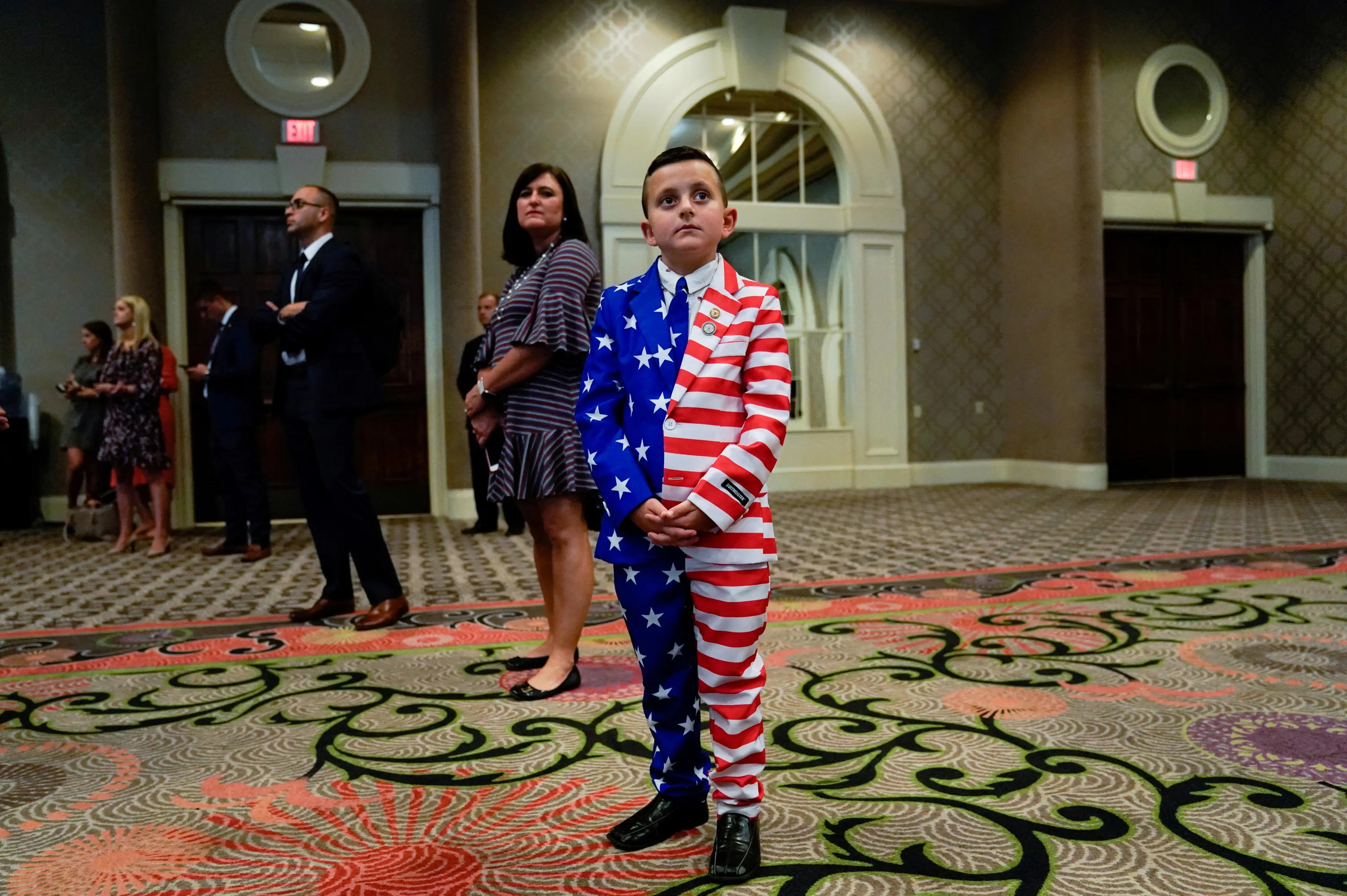 9-year-old Reed Elliotte stands in the back of the room in a U.S. flag outfit with his mother Larrietta listening to U.S. President Donald Trump address the AMVETS American Veterans convention in Louisville, Kentucky U.S. August 21, 2019. (Photo by Kevin Lamarque/Reuters)