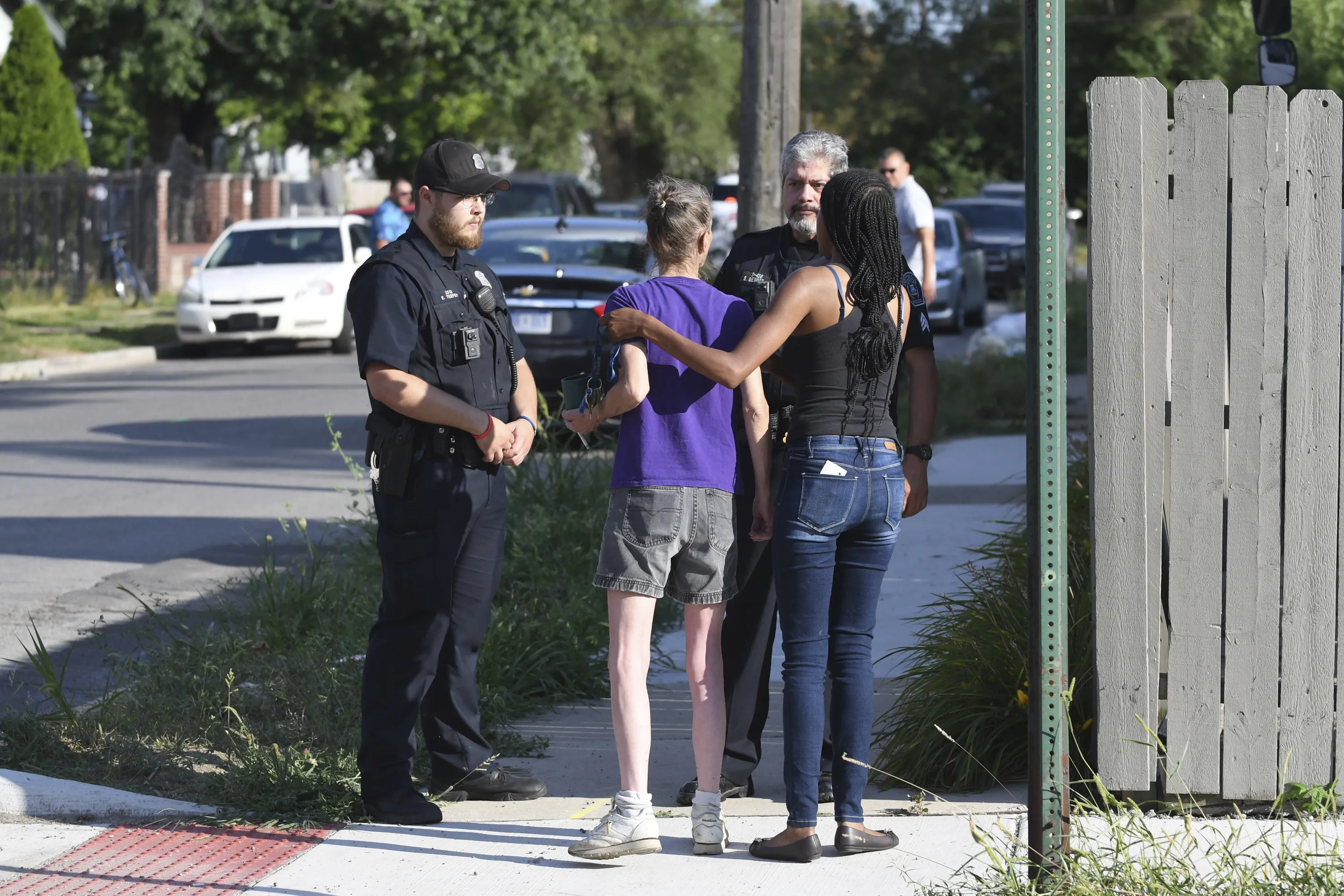 Deborah Golden, center, talks with Detroit police after she tried to render aid to a young girl who later died of her injuries in Detroit on Monday, August 19, 2019. Police say the owner of three dogs is in custody after the animals killed Emma Hernandez, 9, as she rode a bike. The girl's father, Armando Hernandez, says the man was warned that a fence was too flimsy to hold the dogs. (Photo by Max Ortiz/Detroit News via AP Photo)