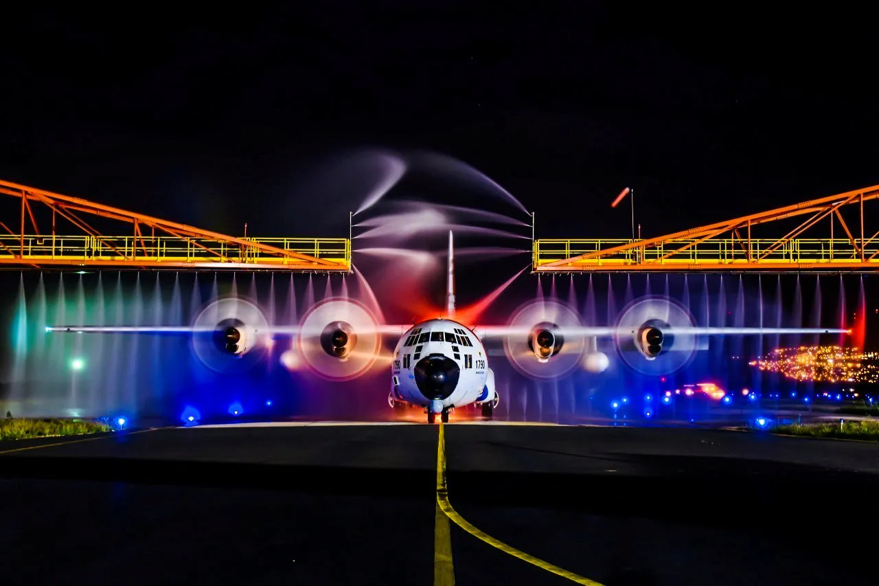 A U.S. Coast Guard HC-130 Hercules airplane receives a wash down to protect it from salt at Air Station Barbers Point, Hawaii, January 24, 2018. Picture taken January 24, 2018. (Photo by Chief Petty Officer Brandon Kelly/Reuters/U.S. Coast Guard)