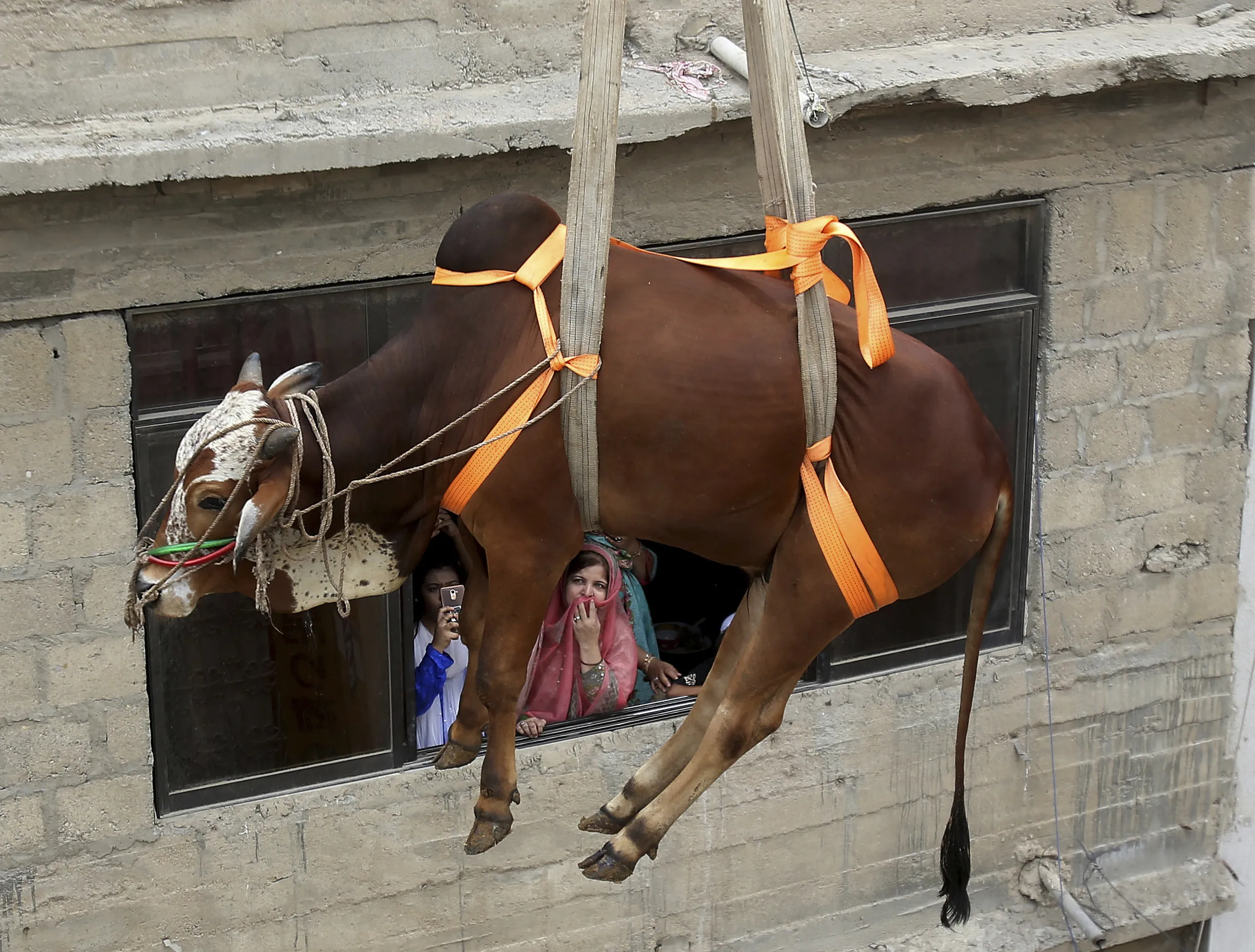 People look as a bull is brought down from the rooftop of a three-story house with a crane, to be sold for the upcoming Muslim Eid al-Adha holiday, in Karachi, Pakistan, Sunday, August 4, 2019. Eid al-Adha, or Feast of Sacrifice, this most important Islamic holiday marks the willingness of the Prophet Ibrahim (Abraham to Christians and Jews) to sacrifice his son. During the holiday, which in most places lasts four days, Muslims slaughter sheep or cattle, distribute part of the meat to the poor and eat the rest. (Photo by Fareed Khan/AP Photo)