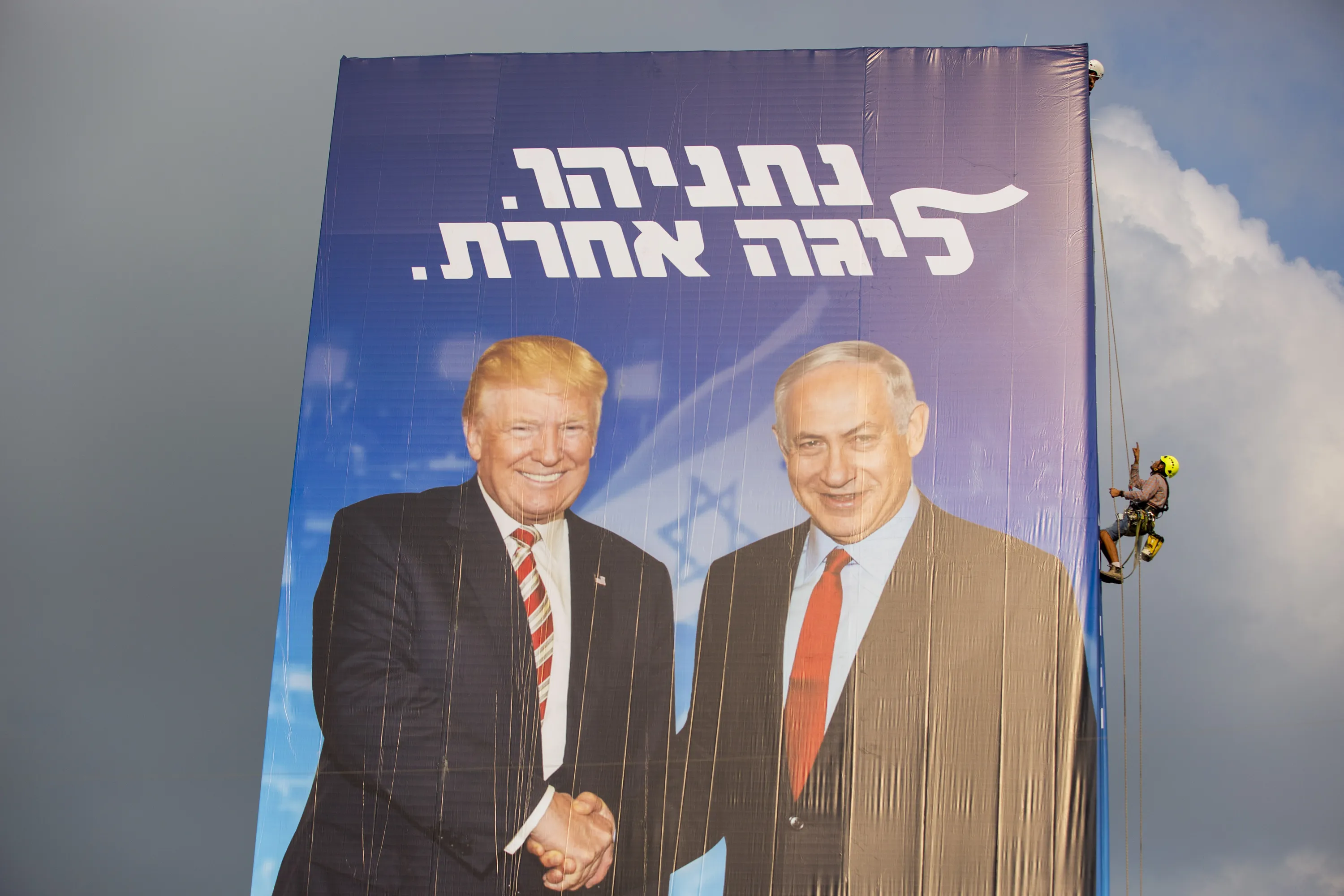 A worker hangs an election campaign billboard of the Likud party shows Israeli Prime Minister Benjamin Netanyahu, right, and US President Donald Trump in Bnei Brak, Israel, Sunday, September 8, 2019. Hebrew on the billboard reads “Netanyahu, in another league”. (Photo by Oded Balilty/AP Photo)