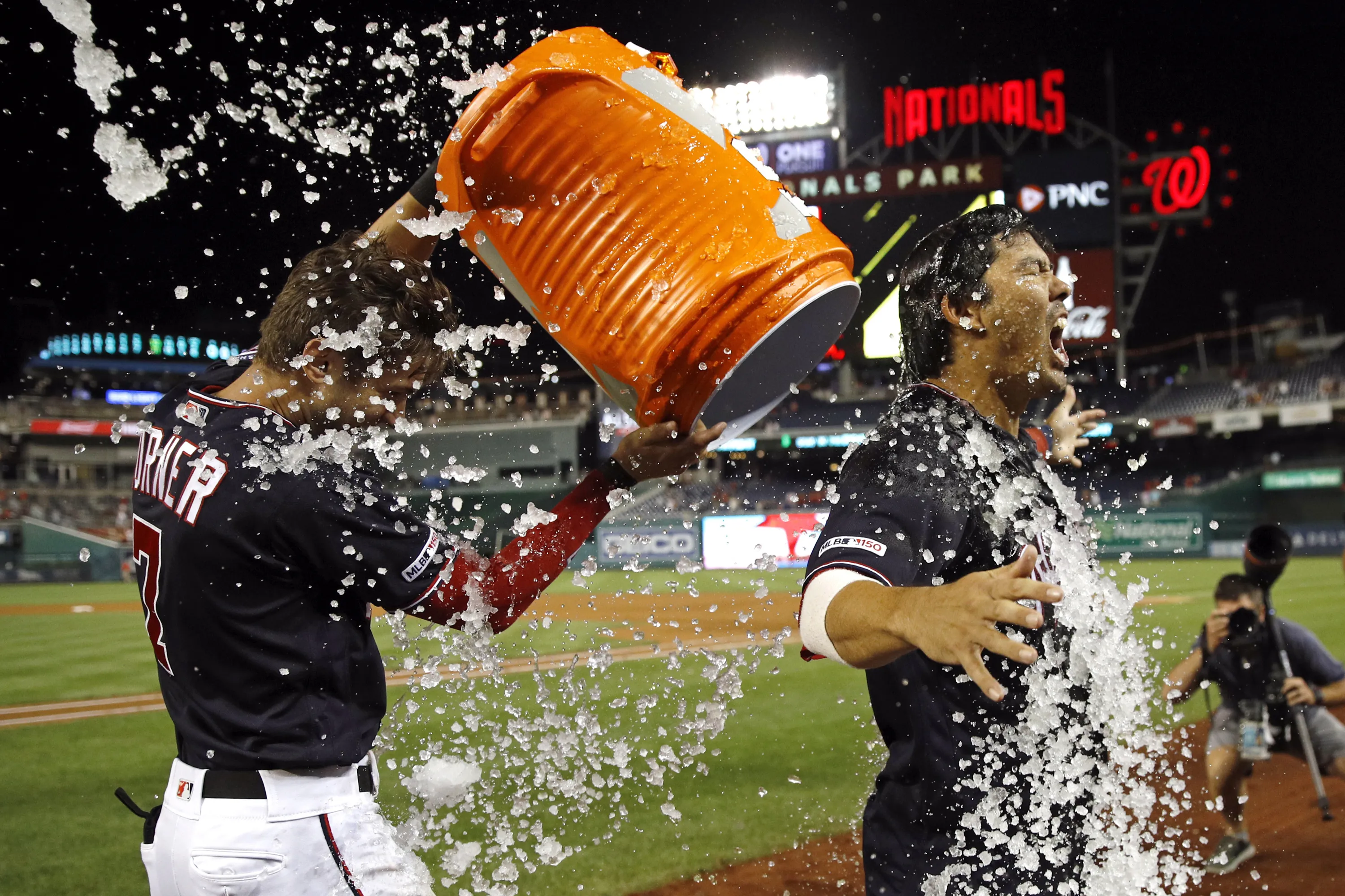 Washington Nationals' Kurt Suzuki, right, is doused by Trea Turner after hitting a game-winning three-run home run in the ninth inning of the team's baseball game against the New York Mets, Tuesday, September 3, 2019, in Washington. Washington won 11-10. (Photo by Patrick Semansky/AP Photo)