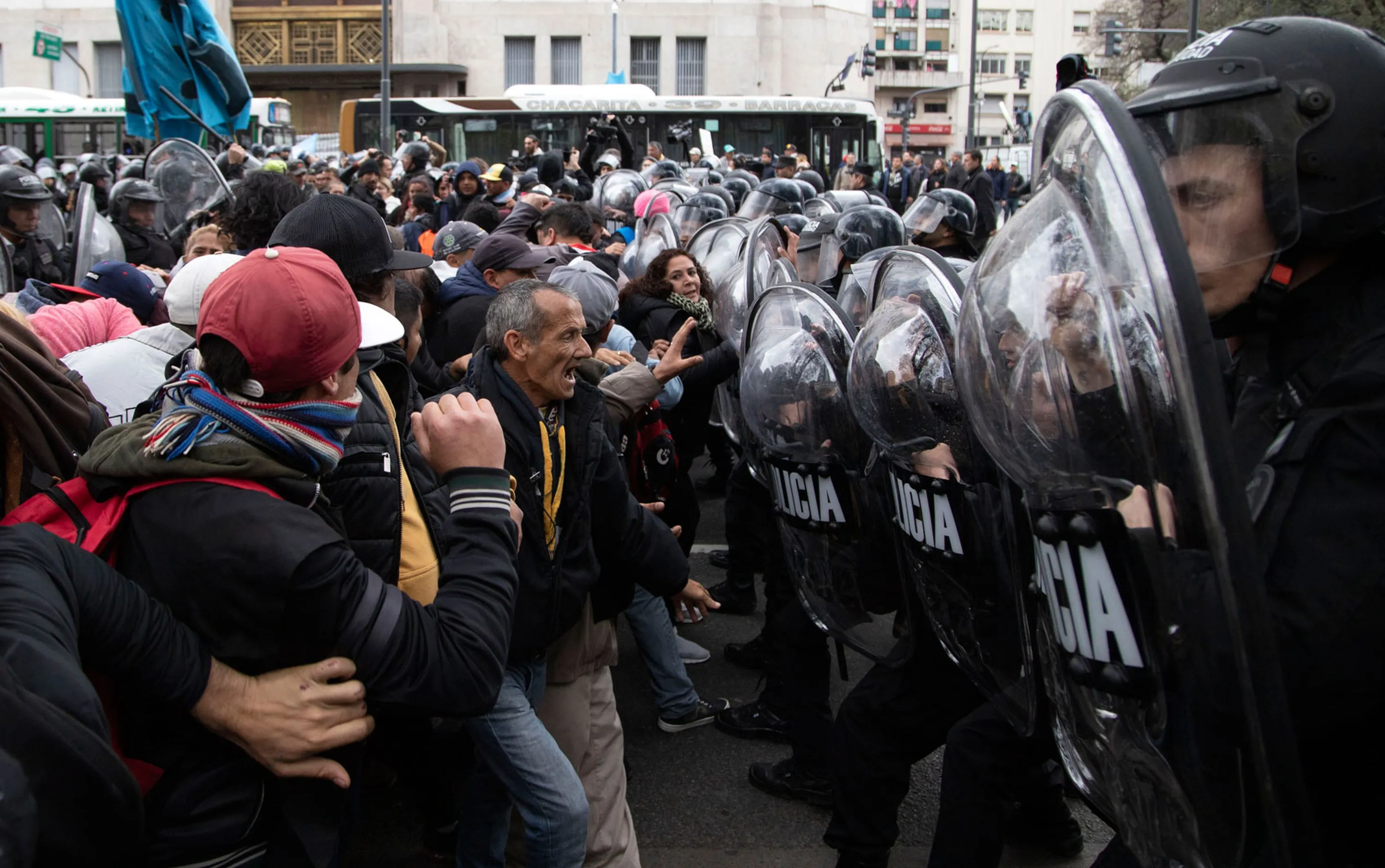 Photo released by Noticias Argentinas of protesters clashing with riot police outside the Social Development Ministry building in Buenos Aires on September 11, 2019. Social organizations set up an overnight camp in front of the ministry's building to call on the government to declare a food emergency. (Photo by Damian Dopacio/Noticias Argentinas/AFP Photo)