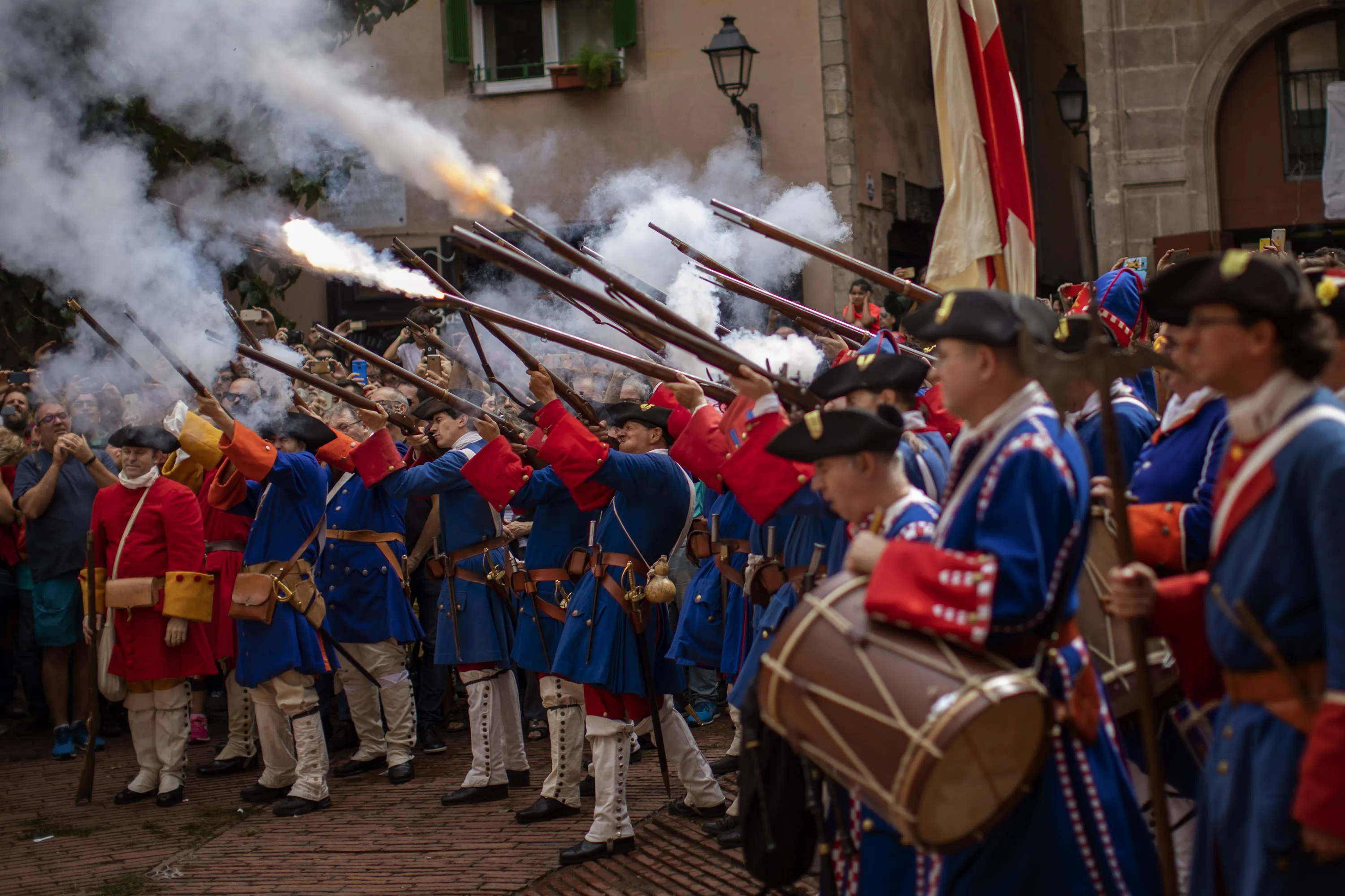 Men dressed in costume shoot their rifles during a performance to celebrate the Catalan National Day in Barcelona, Spain, Wednesday, September 11, 2019. The traditional September 11, called “Diada”, marks the fall of the Catalan capital to Spanish forces in 1714. (Photo by Emilio Morenatti/AP Photo)