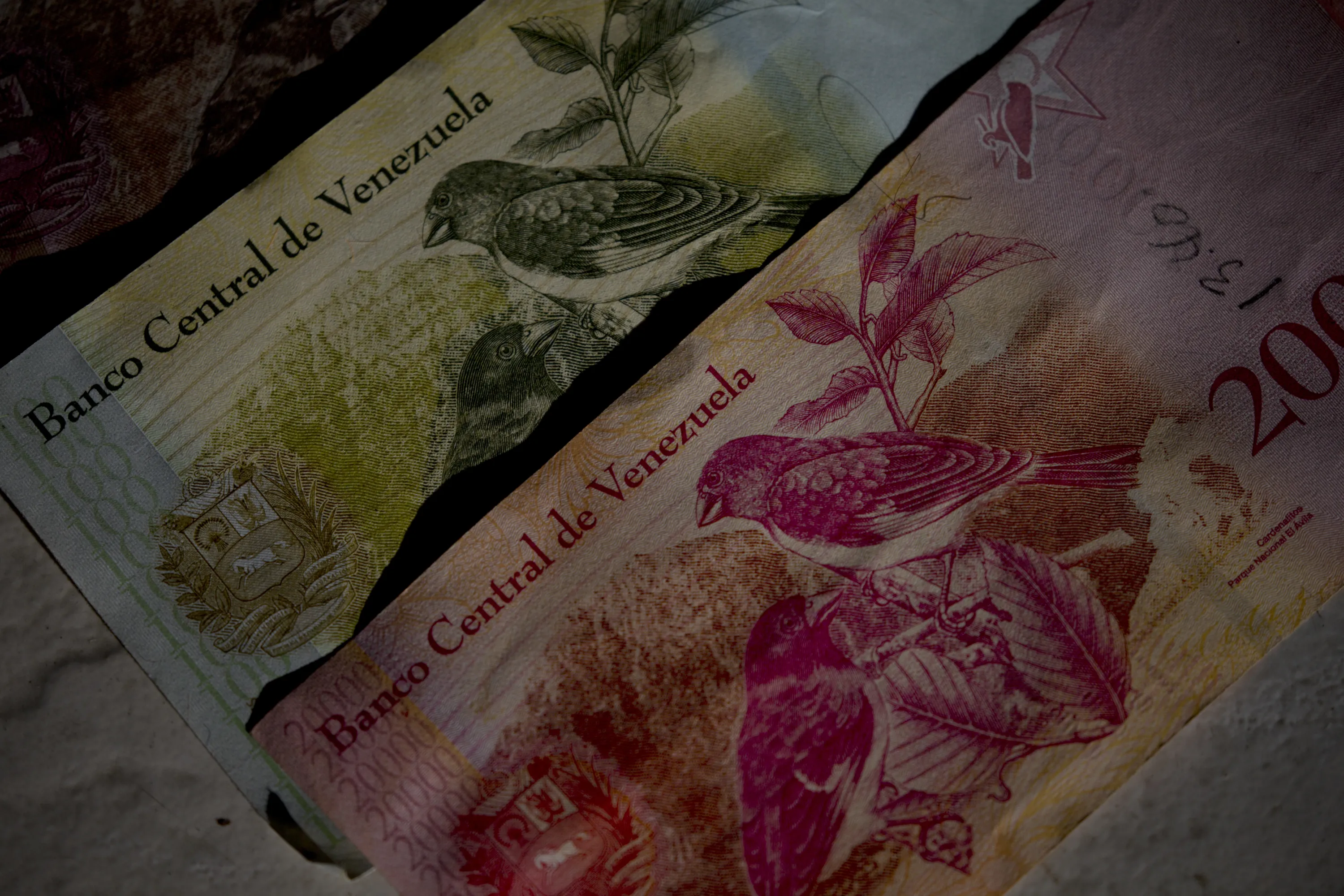 This October 20, 2018 photo shows Bolivar bank notes decorated with images of Venezuela's red siskin bird, as part of rescue program in Caracas, Venezuela. Images of a tiny red bird that barely fills the palm of one's hand appear everywhere in Venezuela – printed on money, labels of craft beer bottles and the cover of children's school books. (Photo by ernando Llano/AP Photo)
