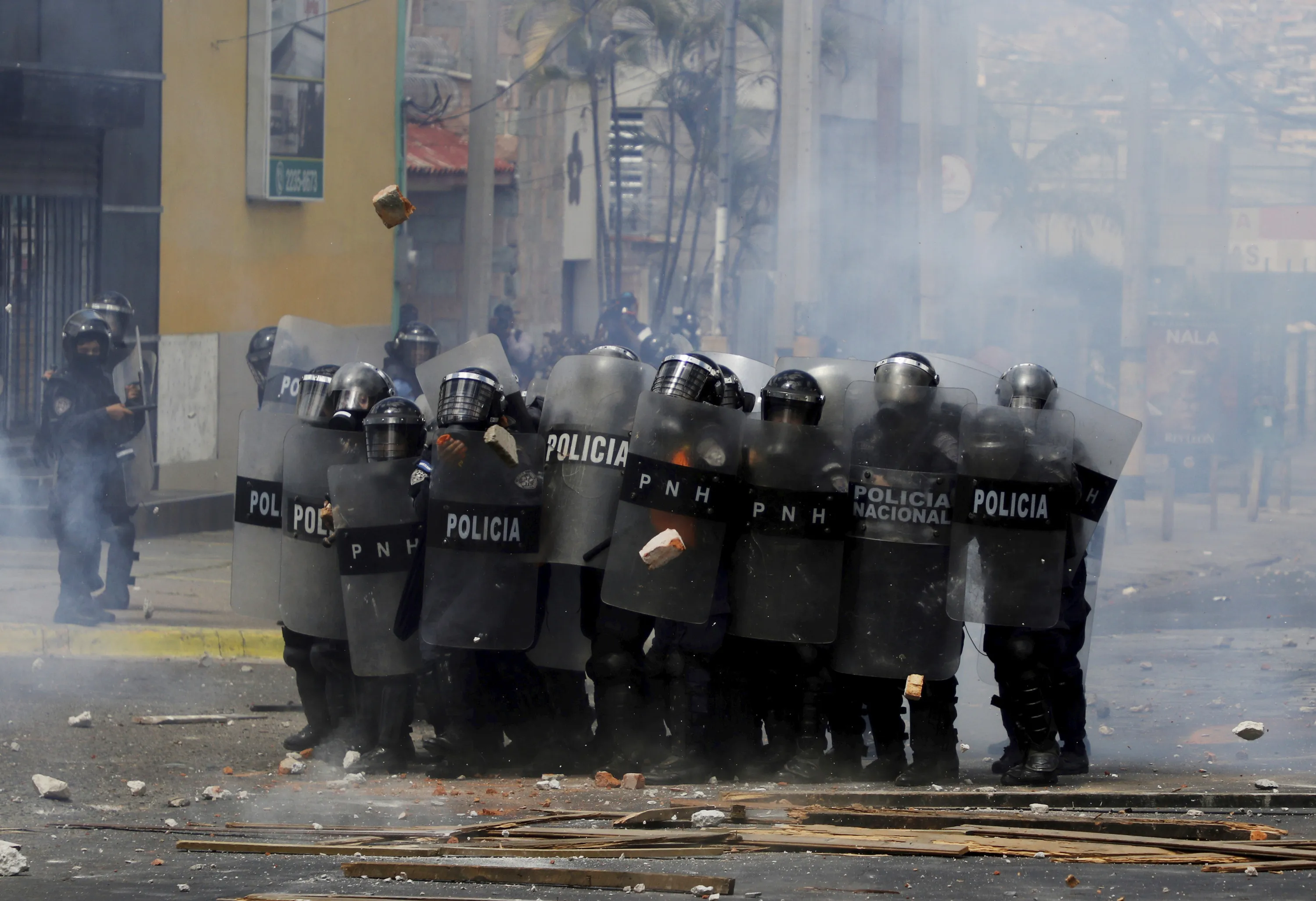 Police stand in riot gear as they face demonstrators during a protest demanding the resignation of President Juan Orlando Hernandez, in Tegucigalpa, Honduras, Sunday, September 15, 2019. Thousands of Hondurans are demanding the resignation of Hernandez. (Photo by Elmer Martinez/AP Photo)