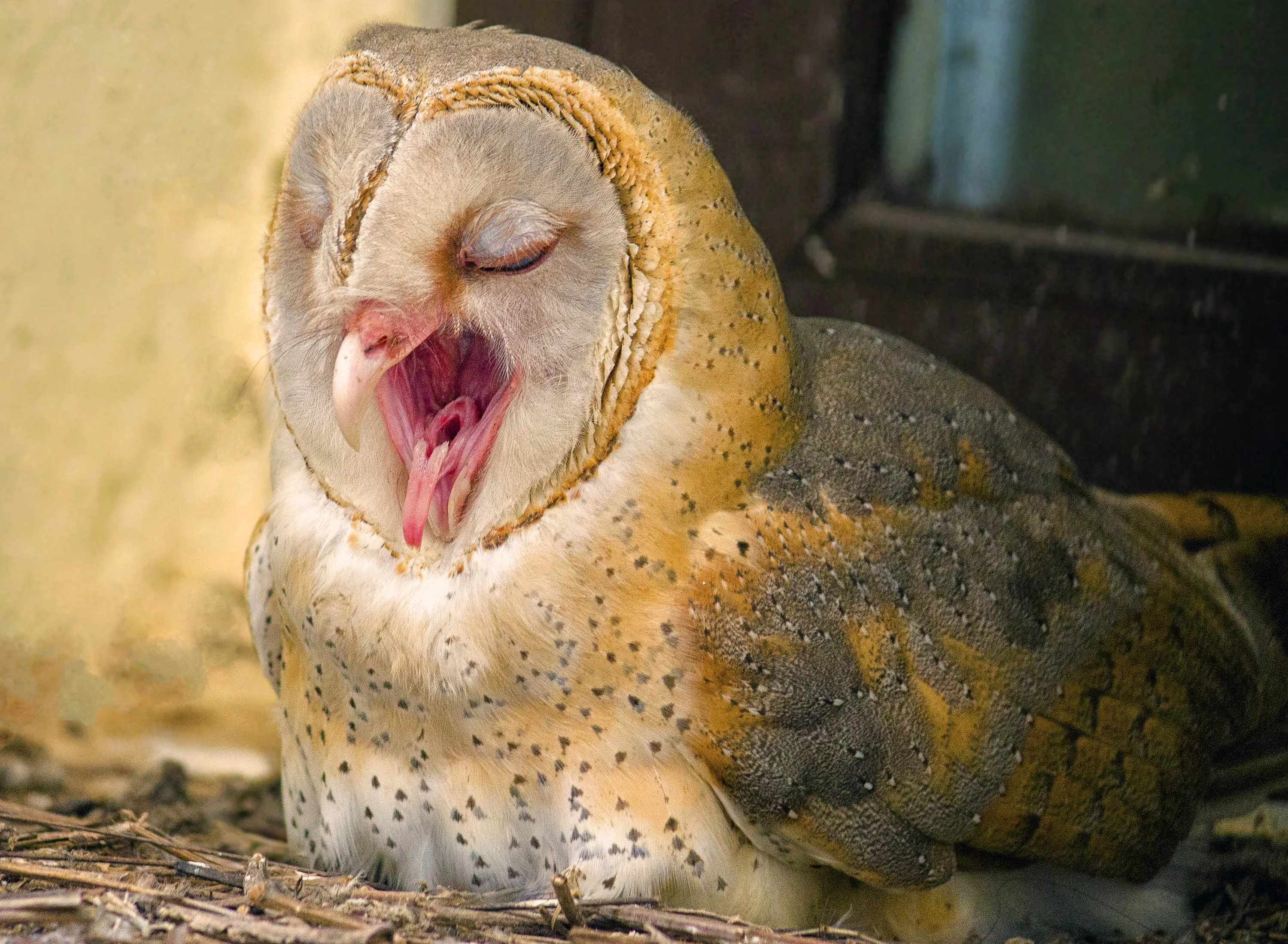 A tiny light-feathered barn owl with a perfectly heart shaped face,yawning. (Photo by Ck Patnaik/Caters News Agency)