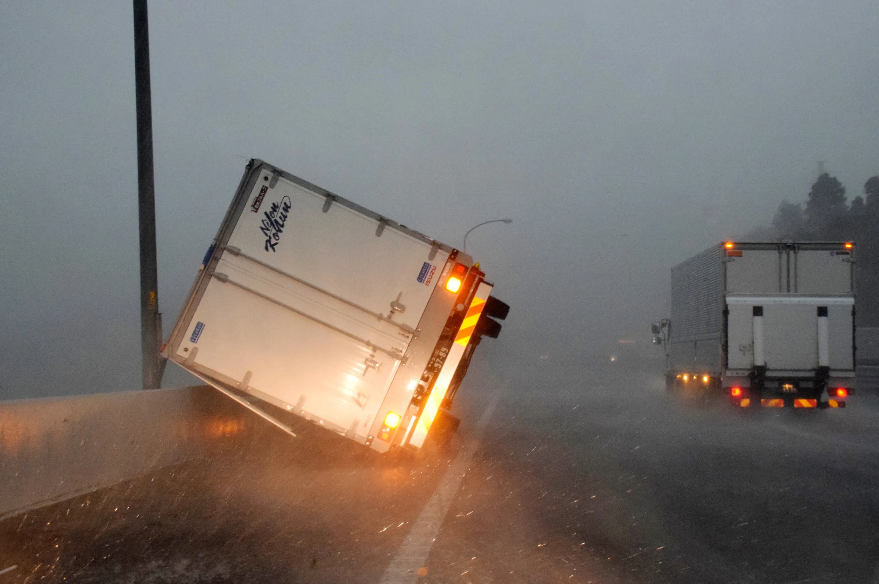 A truck lies on its side due to strong wind generated by Typhoon Faxai on a highway in Tomisato, Chiba prefecture, near Tokyo, Japan, 09 September 2019. Typhoon Faxai landed near Tokyo overnight, affecting commuters from the early morning on due to suspended train and airlines services. According to latest media reports, 20 people were injured as a result of the storm. (Photo by JIJI Press/EPA/EFE)