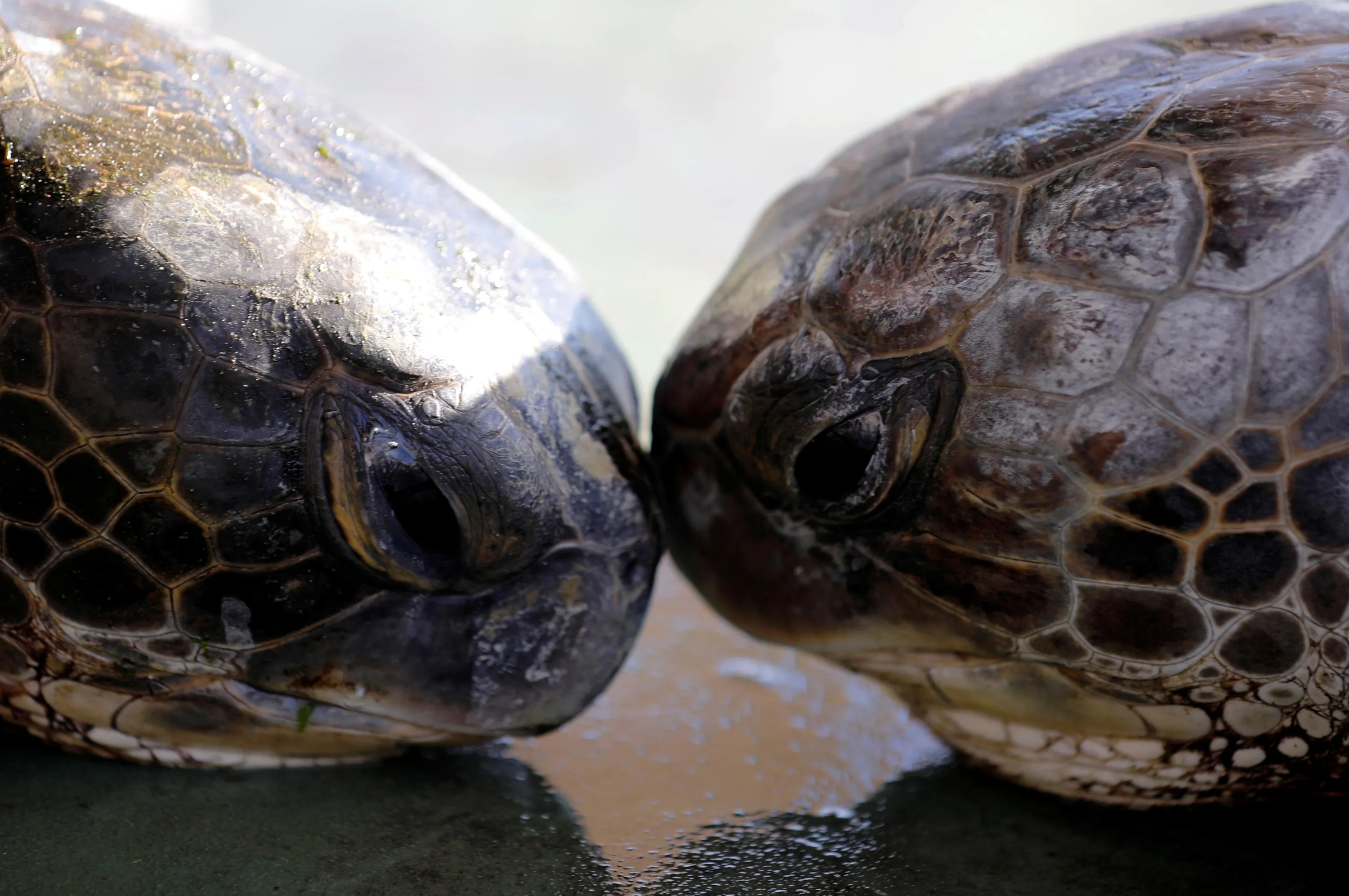 Two green sea turtles touch heads at the Israeli Sea Turtle Rescue Center, in Mikhmoret north of Tel Aviv, Israel September 23, 2019. (Photo by Amir Cohen/Reuters)