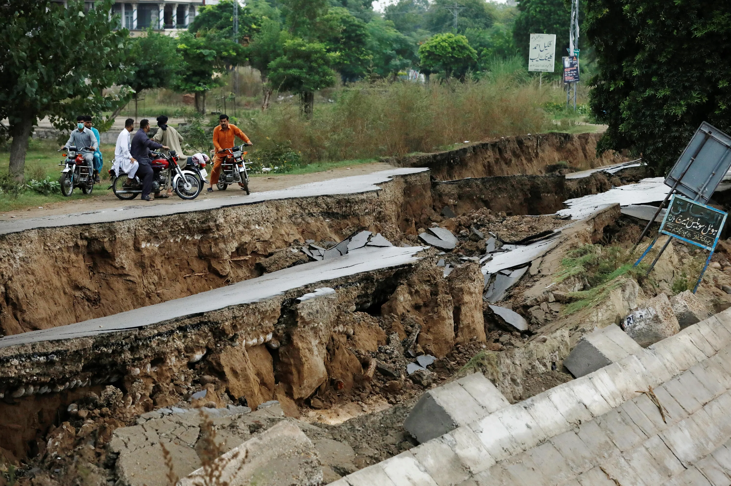 People on bikes gather near a damaged road after an earthquake in Mirpur, Pakistan, September 25, 2019. The death toll from an earthquake that struck Pakistani Kashmir jumped to 37, officials said on Wednesday, as families mourned relatives and rescue teams sent supplies to the area. (Photo by Akhtar Soomro/Reuters)