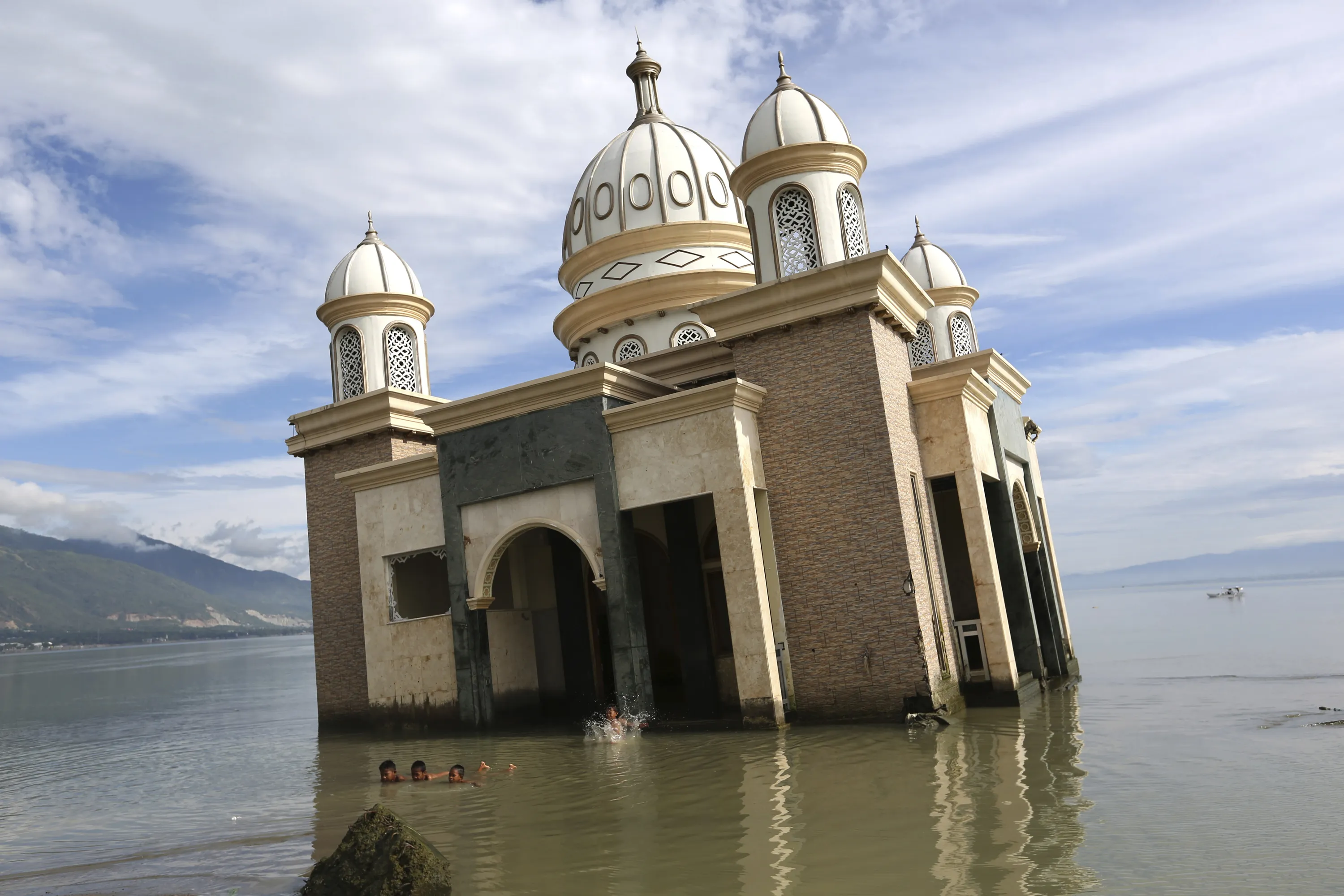 In this Wednesday, April 3, 2019, photo, children play in the water on a beach near a mosque collapsed during Sept. 28, 2018, earthquake is seen in the background in Palu, Central Sulawesi, Indonesia. The earthquake spawned a large localized tsunami that wiped out coastal areas, while liquefaction caused by the shaking turned entire neighborhoods into rivers of sludge. The disaster killed thousands of people, making it the world’s deadliest seismic event in 2018. (Photo by Tatan Syuflana/AP Photo)