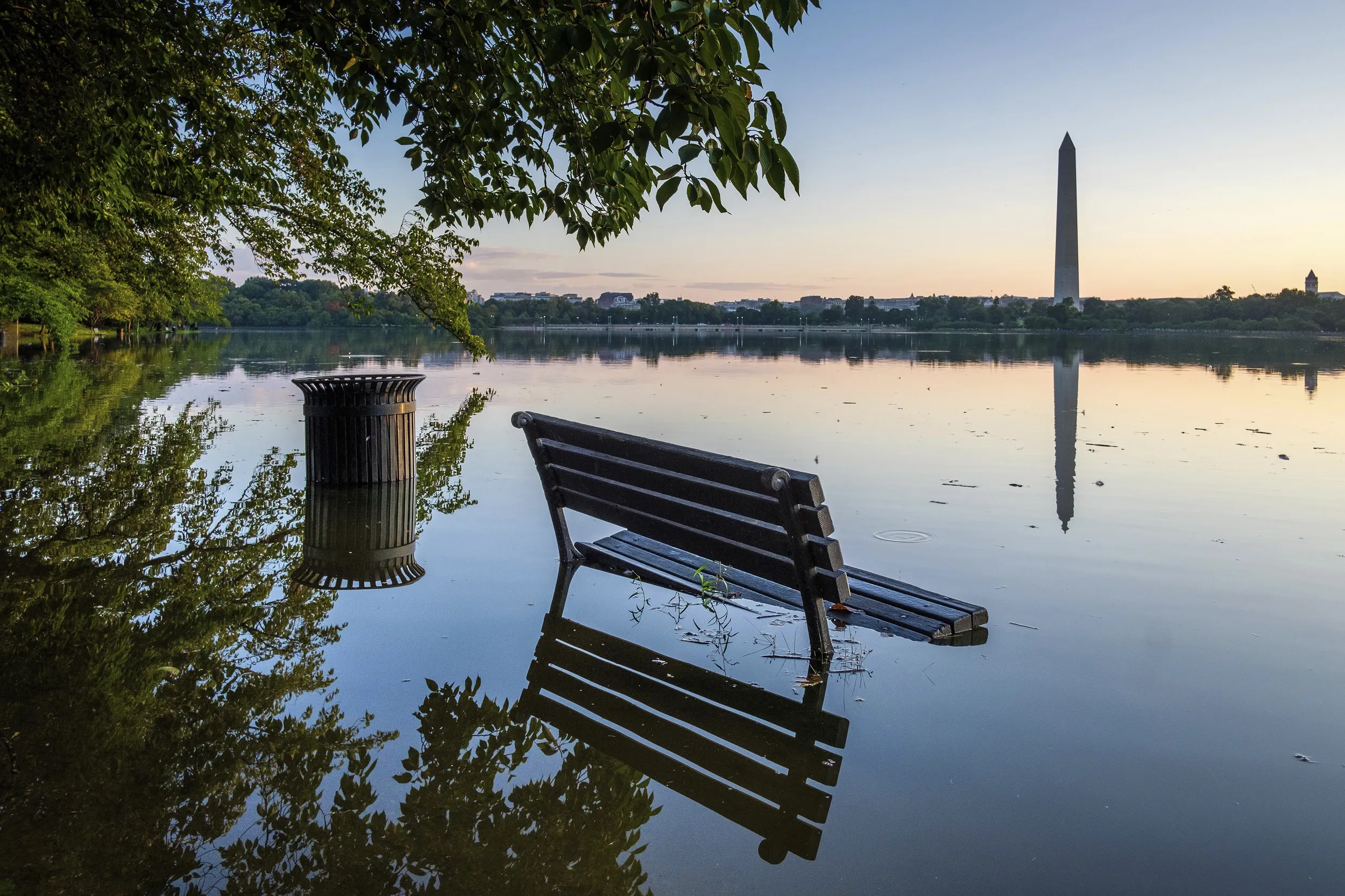 A bench is surrounded by water after recent heavy rains caused the Tidal Basin in Washington to overflow its banks Wednesday, August 22, 2018. (Photo by J. David Ake/AP Photo)