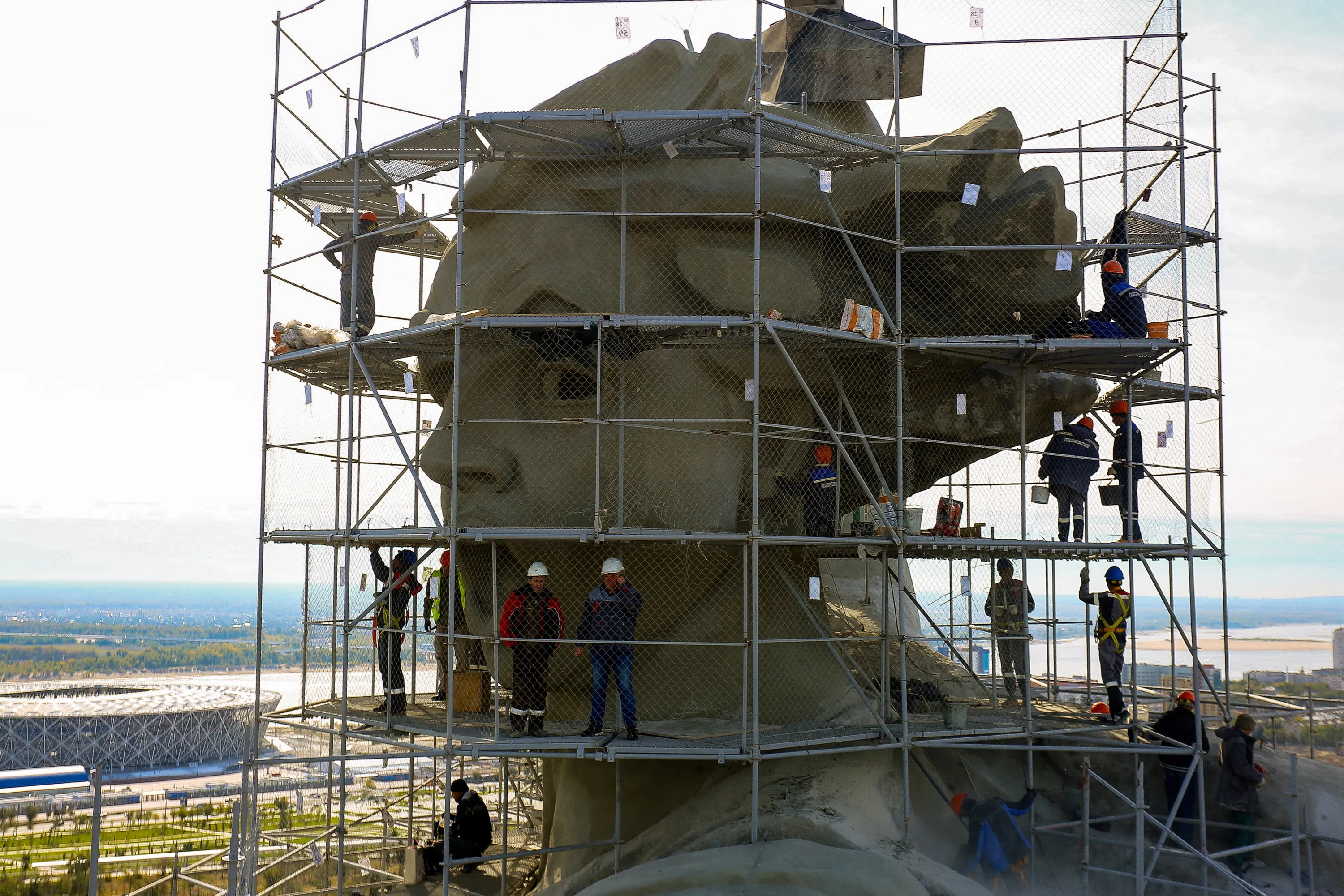 A view of the WWII monument “The Motherland Calls” atop Mamayev Kurgan in Volgograd, Russia on September 26, 2019, restoration works due for completion by May 9, 2020 – the 75th anniversary of the victory over Nazi Germany in World War II. (Photo by Dmitry Rogulin/TASS)