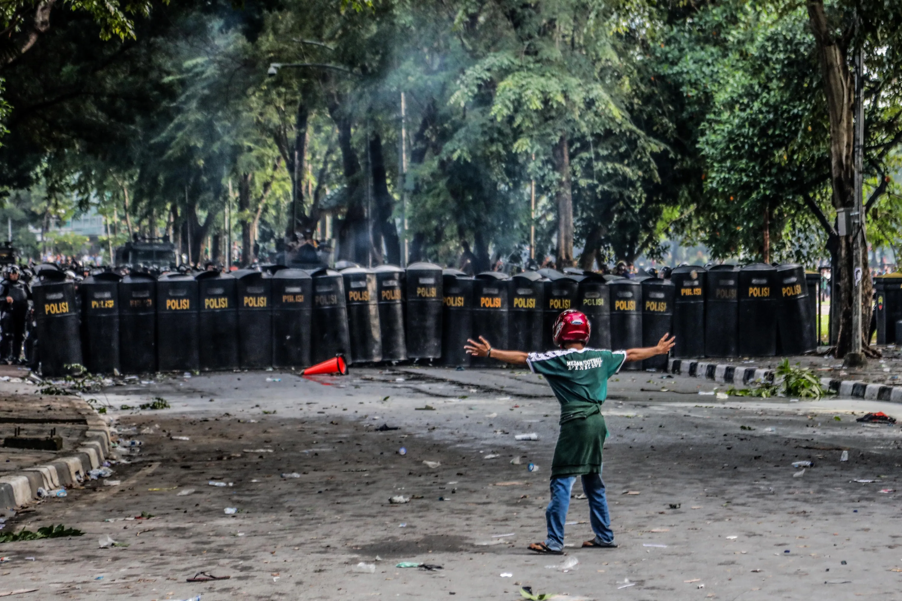 Indonesian students clash with police officers during a protest in Medan, North Sumatra, Indonesia, 27 September 2019. Thousands of students staged protests across the country against a new law that proposed a change in criminal code laws and weakened the country's anti-corruption commission. (Photo by Dedi Sinuhaji/EPA/EFE)
