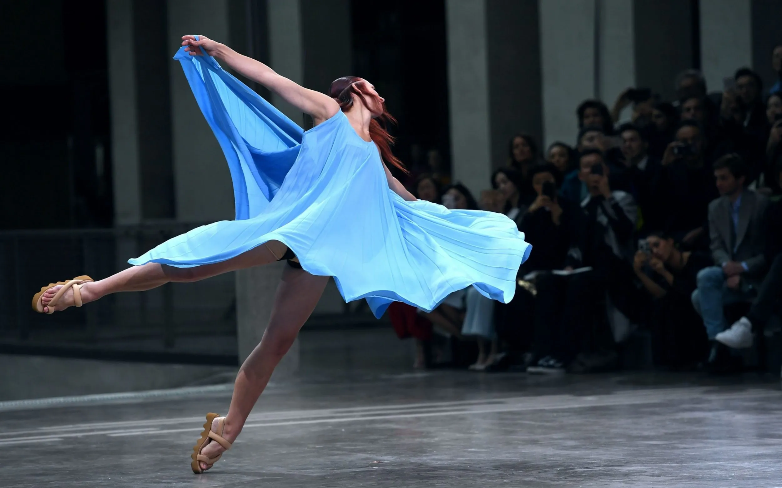 A model floats and dances as she presents a creation by Japanese designer Issey Miyake during the Women's Spring-Summer 2020 Ready-to-Wear collection fashion show, in Paris on September 27, 2019. (Photo by Christophe Archambault/AFP Photo)