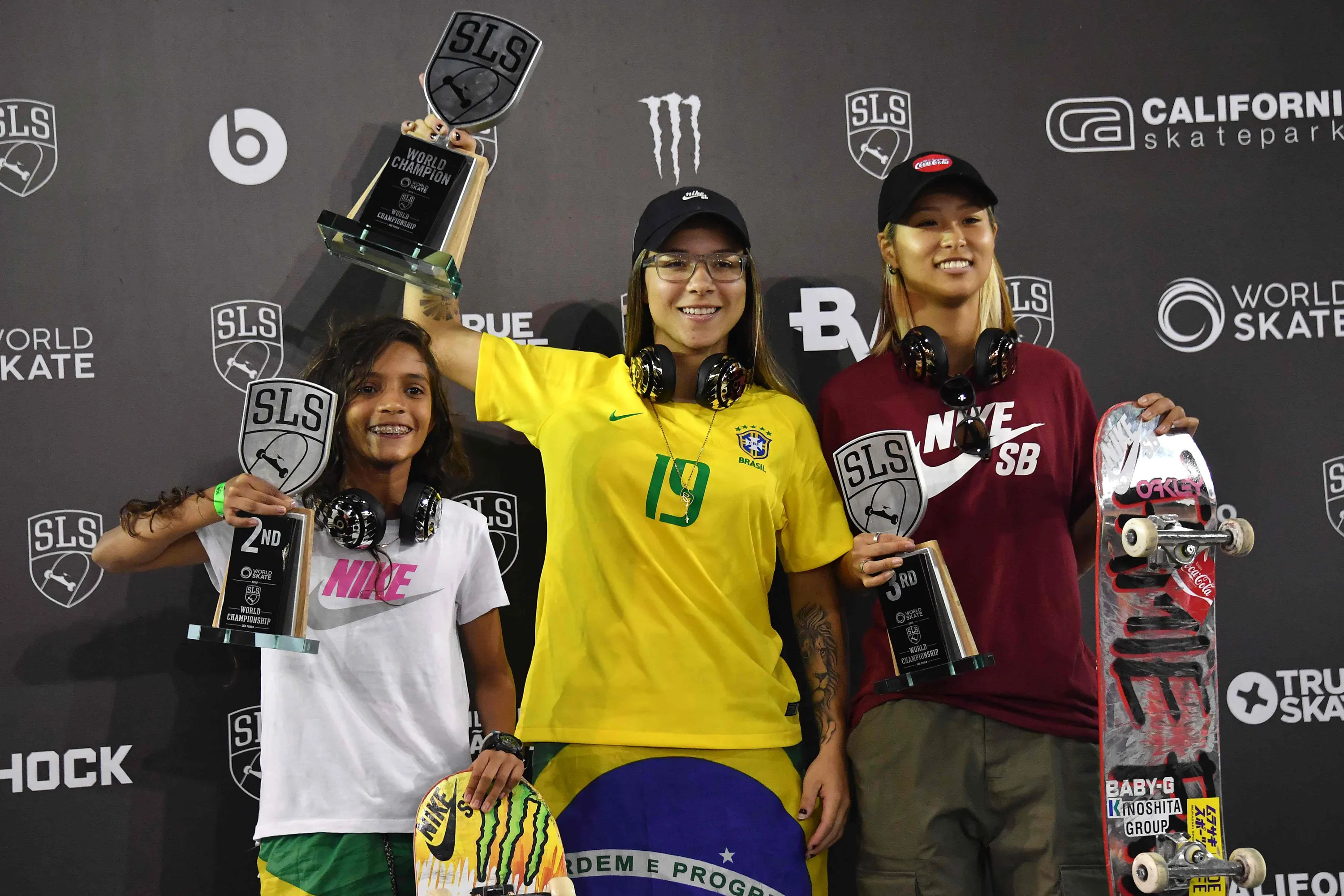 Brazilian skateboarder Pamela Rosa (C) celebrates with Brazilian Rayssa Leal (L) and Japanese Aori Nishimura (R), after getting the fist, second and third places respectively in the Street League Skateboarding world championship in Sao Paulo on September 22, 2019. The championship qualifies for the Tokyo 2020 Olympics where Skateboarding will feature for the first time as an event. (Photo by Nelson Almeida/AFP Photo)