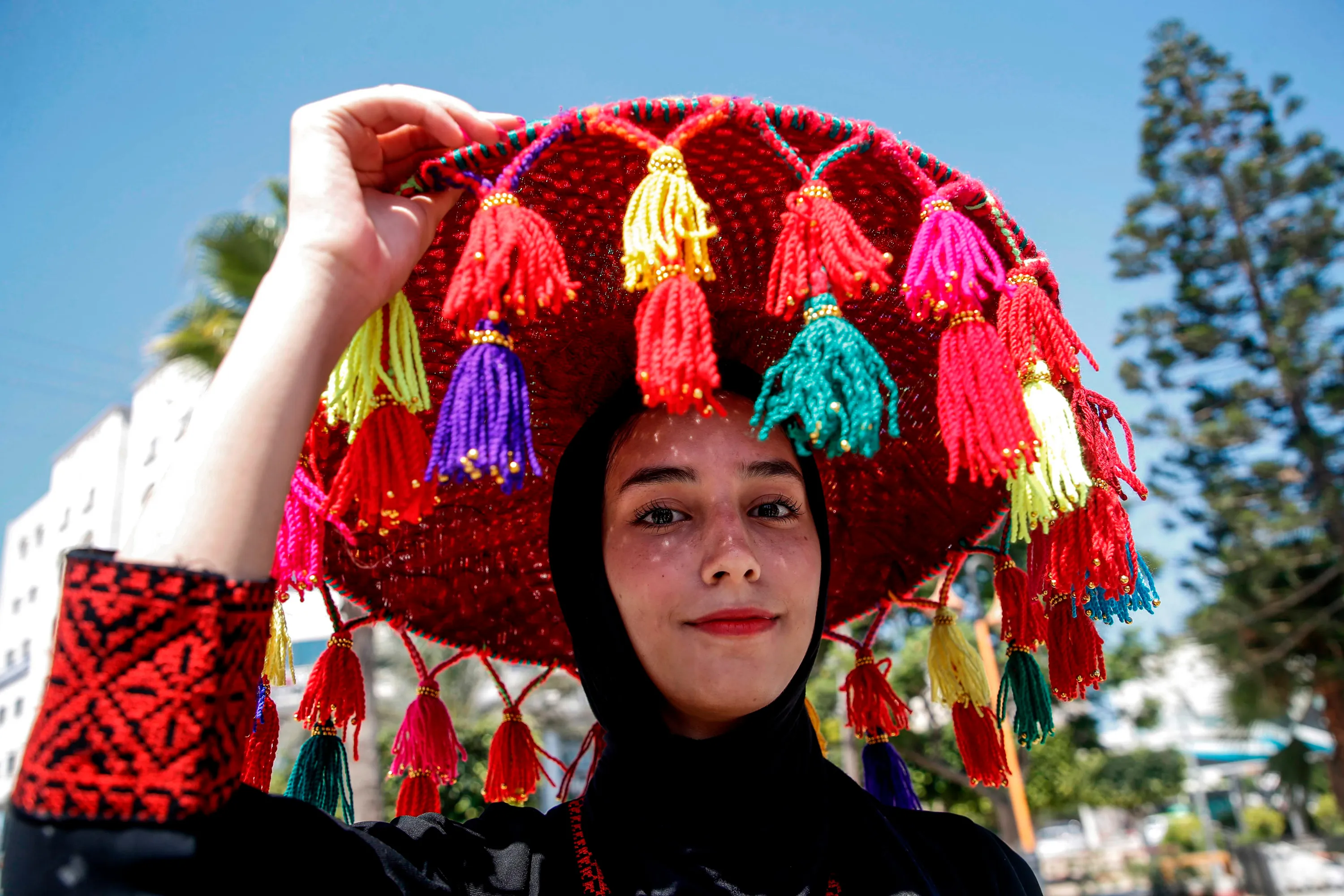 A Palestinian girl wears a traditional headdress as she attends a march marking Palestinian traditional customs day, in Gaza City on July 30, 2019. (Photo by Mohammed Abed/AFP Photo)