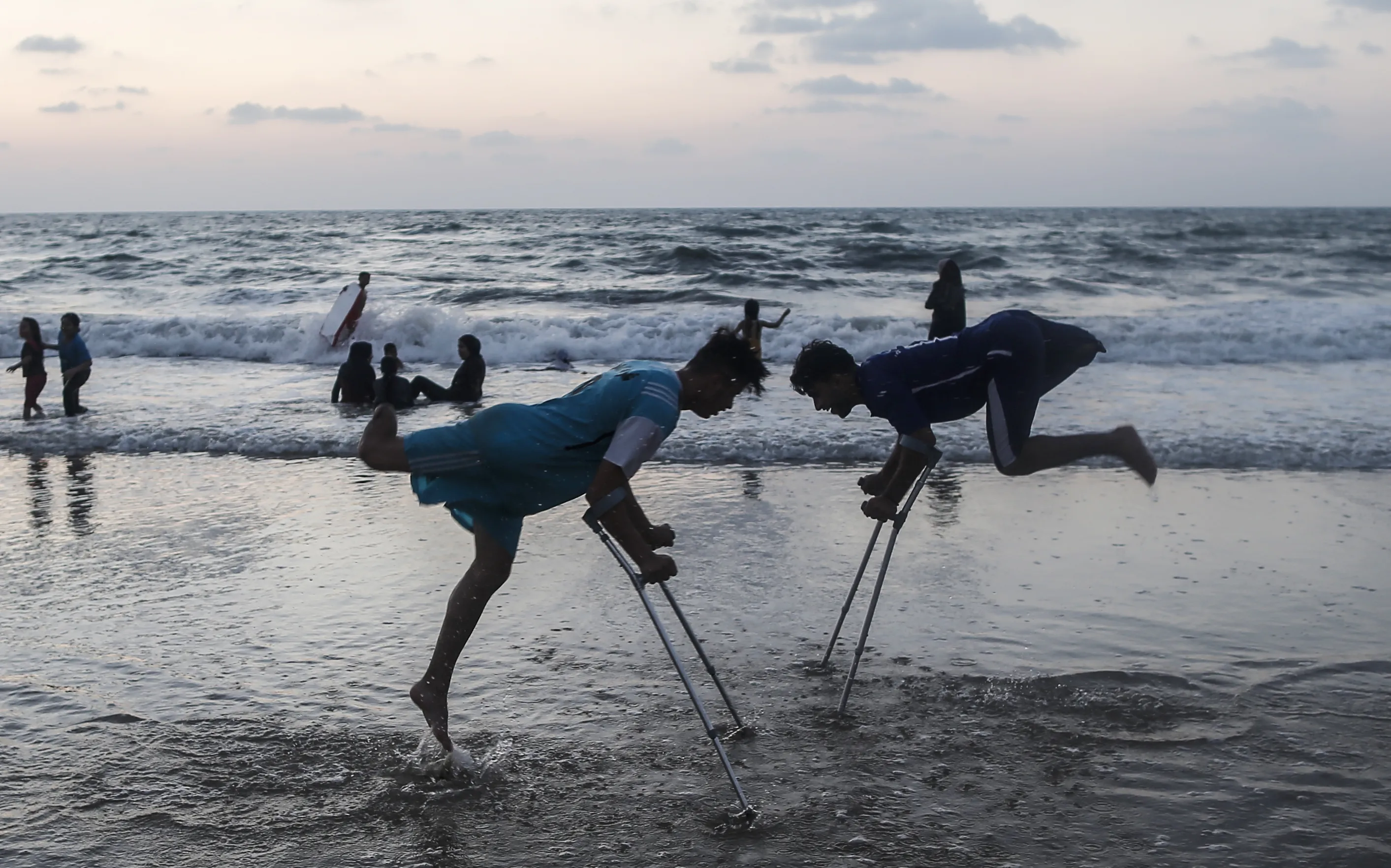 Palestinian amputees Mohammed Eliwa, 17, and Ahmed al-Khoudari (R), 20, who lost their legs during clashes on the border with Israel, play on the beach in Gaza City on August 20, 2019. (Photo by Mahmud Hams/AFP Photo)