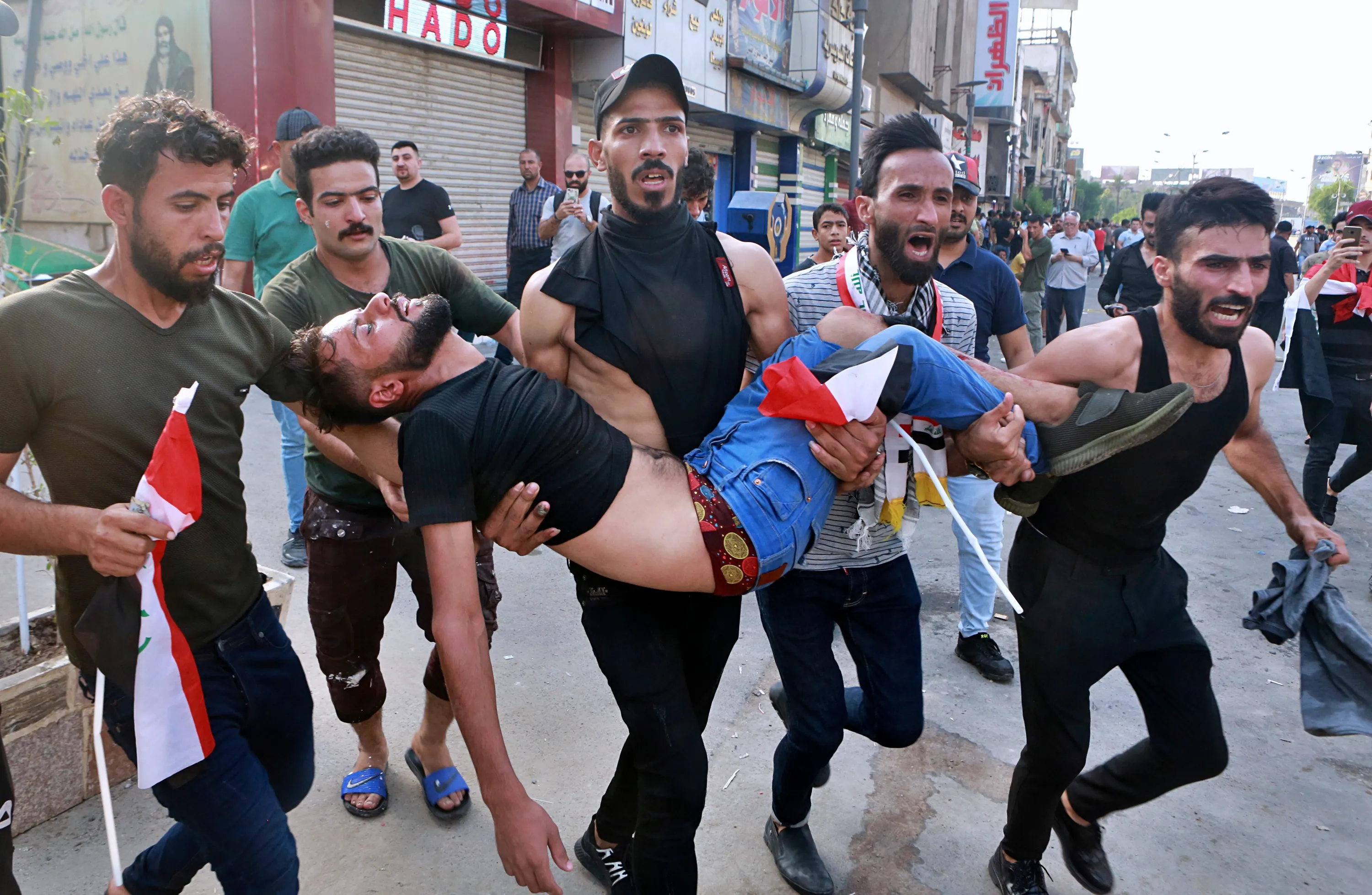 An injured protester is carried after reacting to tear gas fired by security forces during a protest in Tahrir Square, in central Baghdad, Iraq, Tuesday, October 1, 2019. (Photo by Khalid Mohammed/AP Photo)